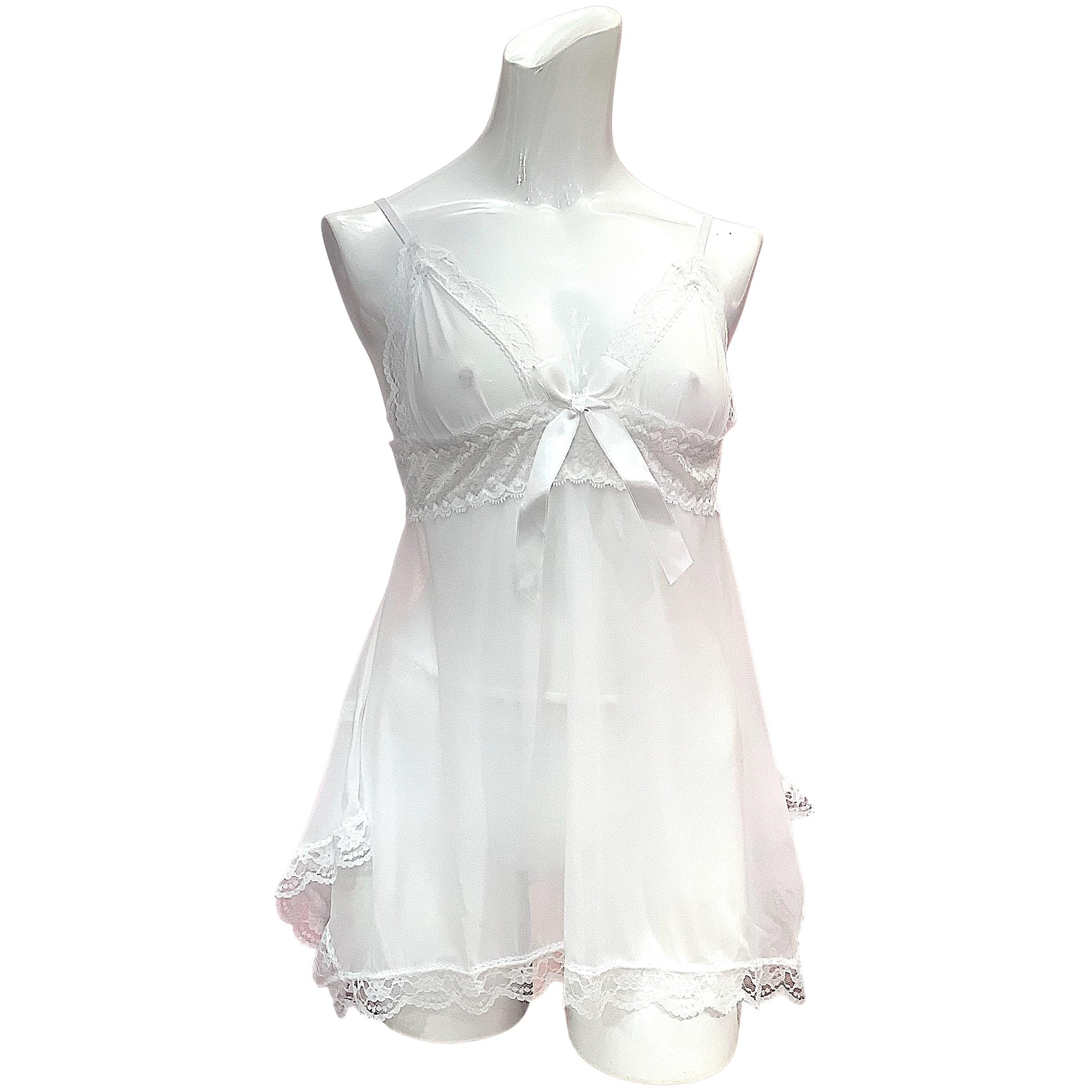 清楚なホワイトカラーに透け感のあるレースを組み合わせた、スリップとGストリングのセット。カップなしデザインで軽やかに着こなせ、女性らしいボディラインを引き立てます。胸元にはリボンをあしらい、可憐なアクセントをプラス。裾のレースが揺れるたびにエレガントさを演出します。ショーツはミニマルなGストリング仕様で、ヒップラインをすっきりと美しく魅せる仕上がり。特別な夜の演出やサプライズギフトとしても人気の大人可愛いランジェリー。