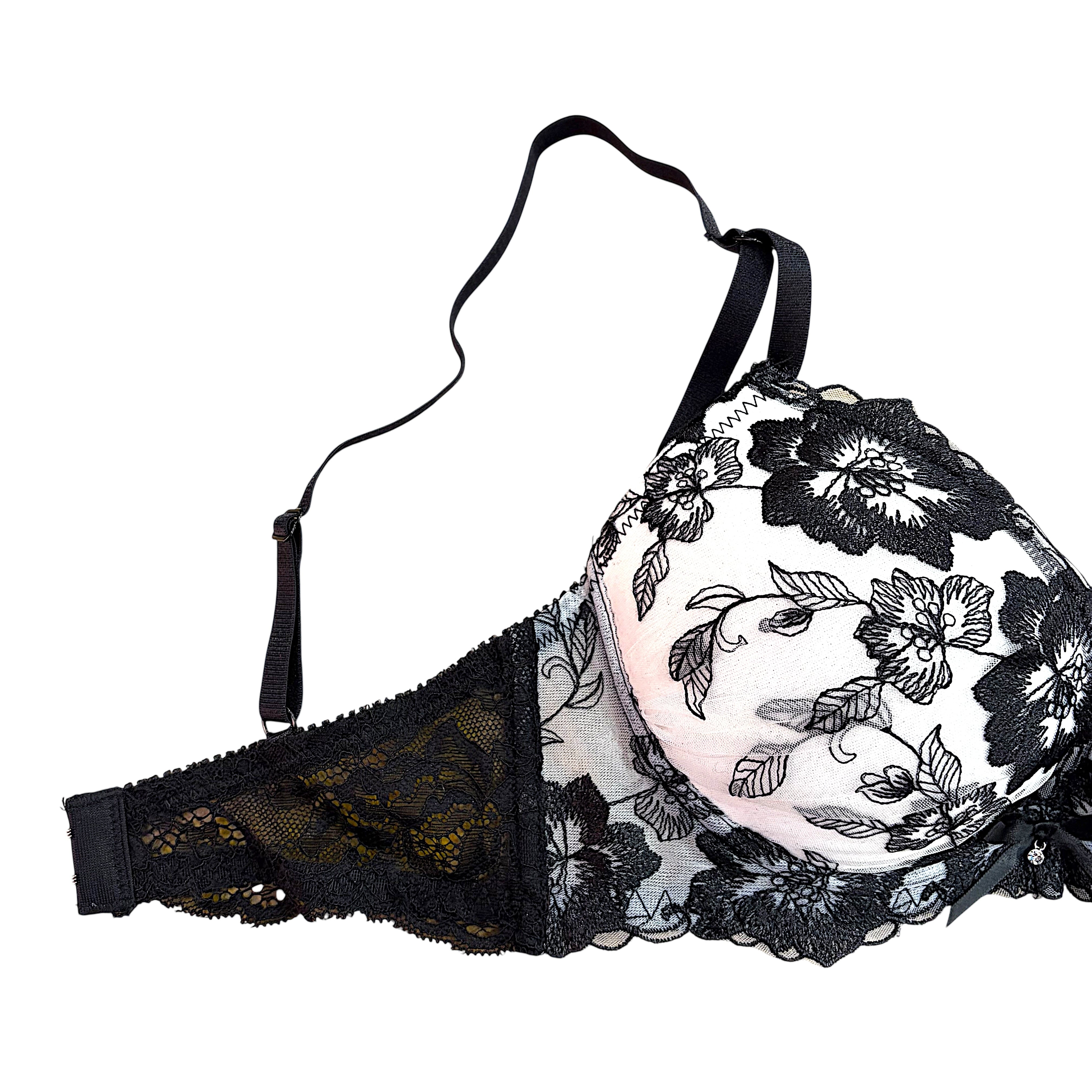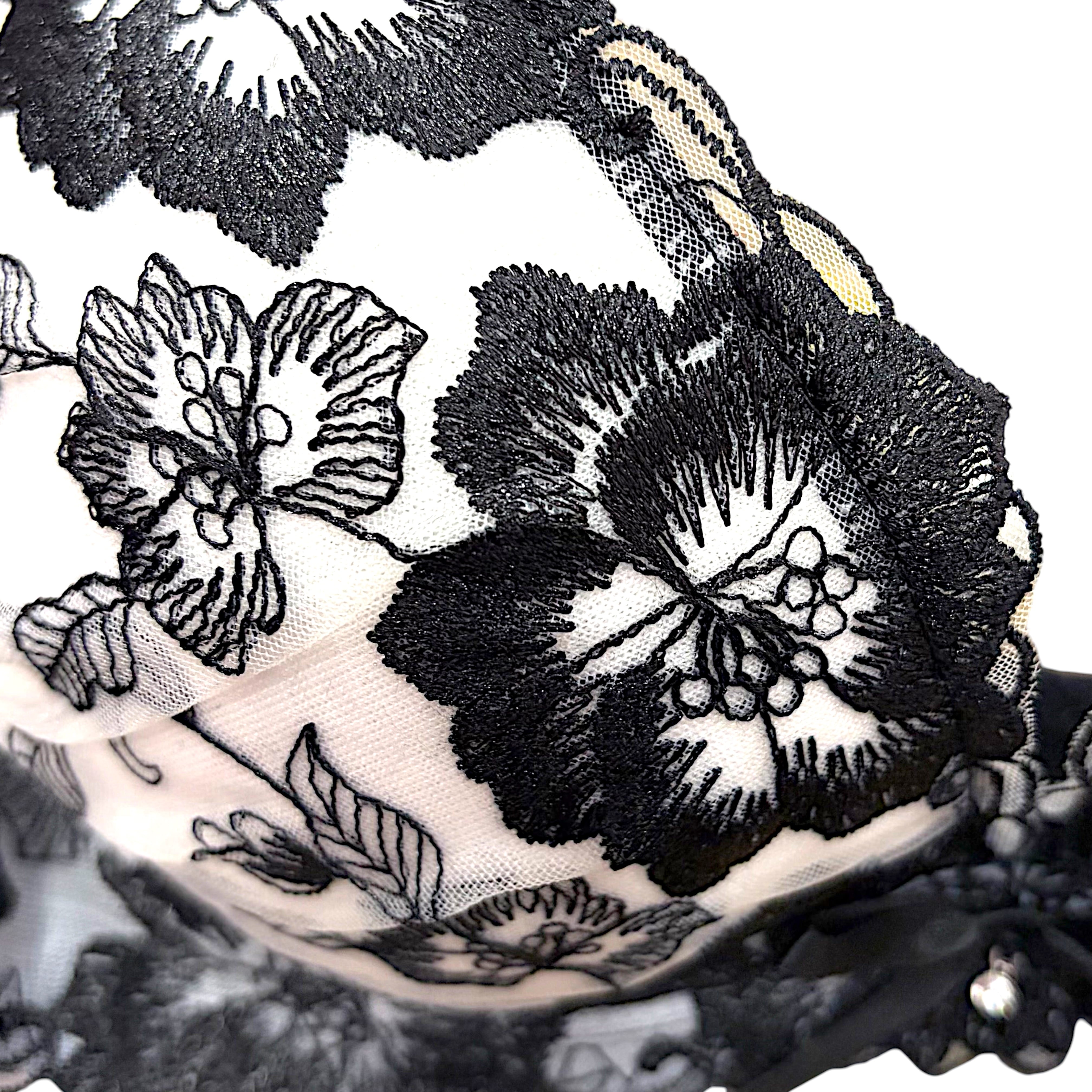 繊細なフラワーレースが華やかに映える、E・Fカップ対応のランジェリーセット。
