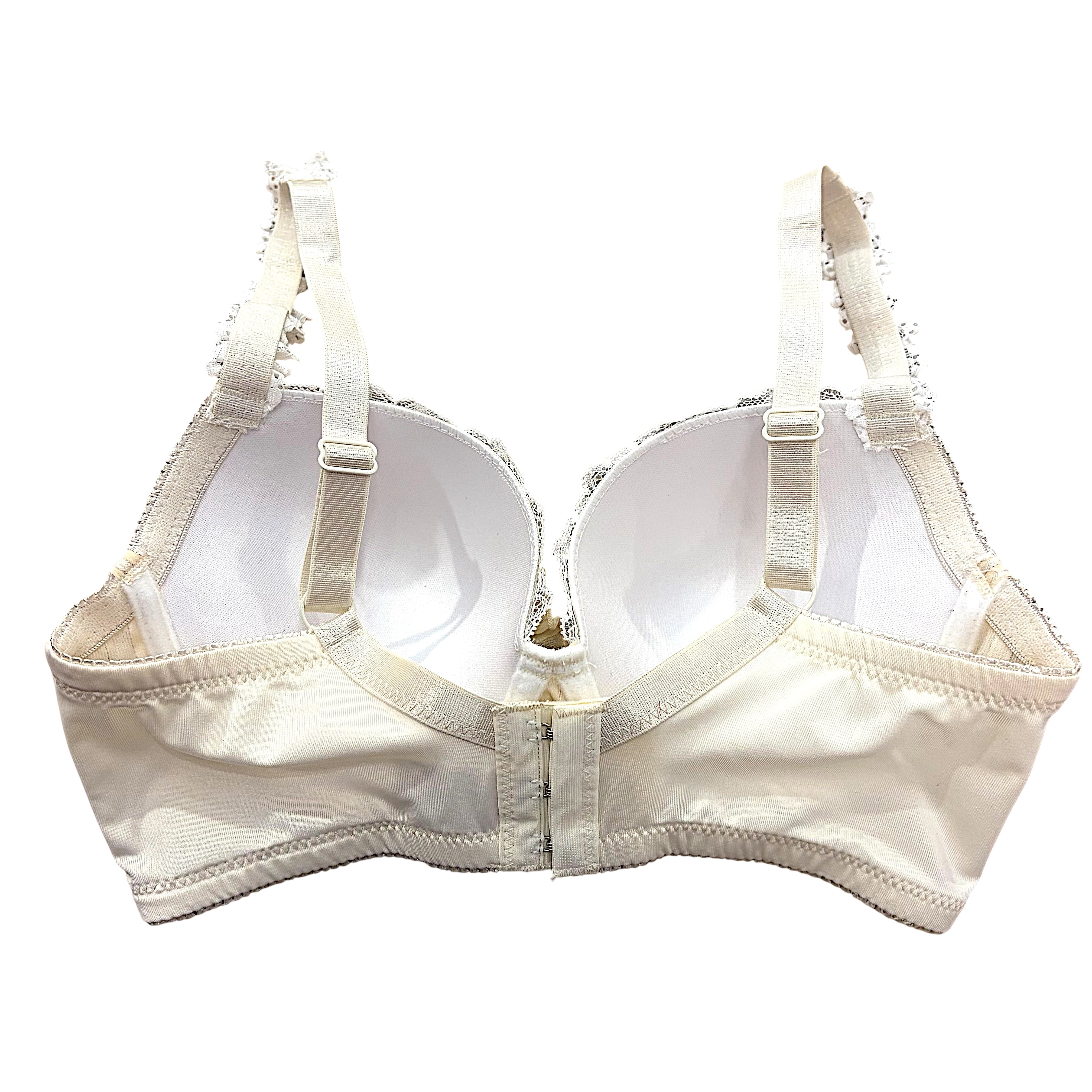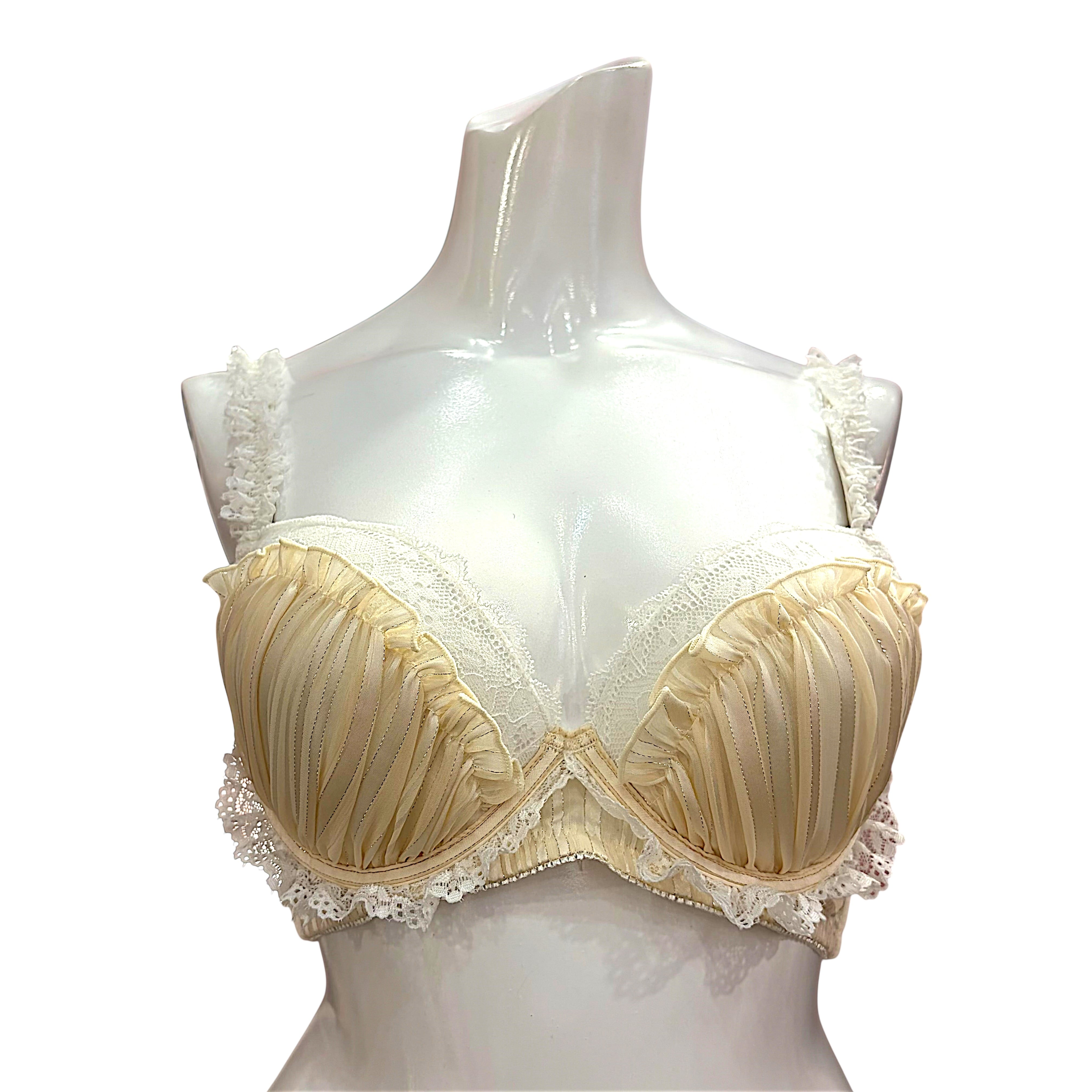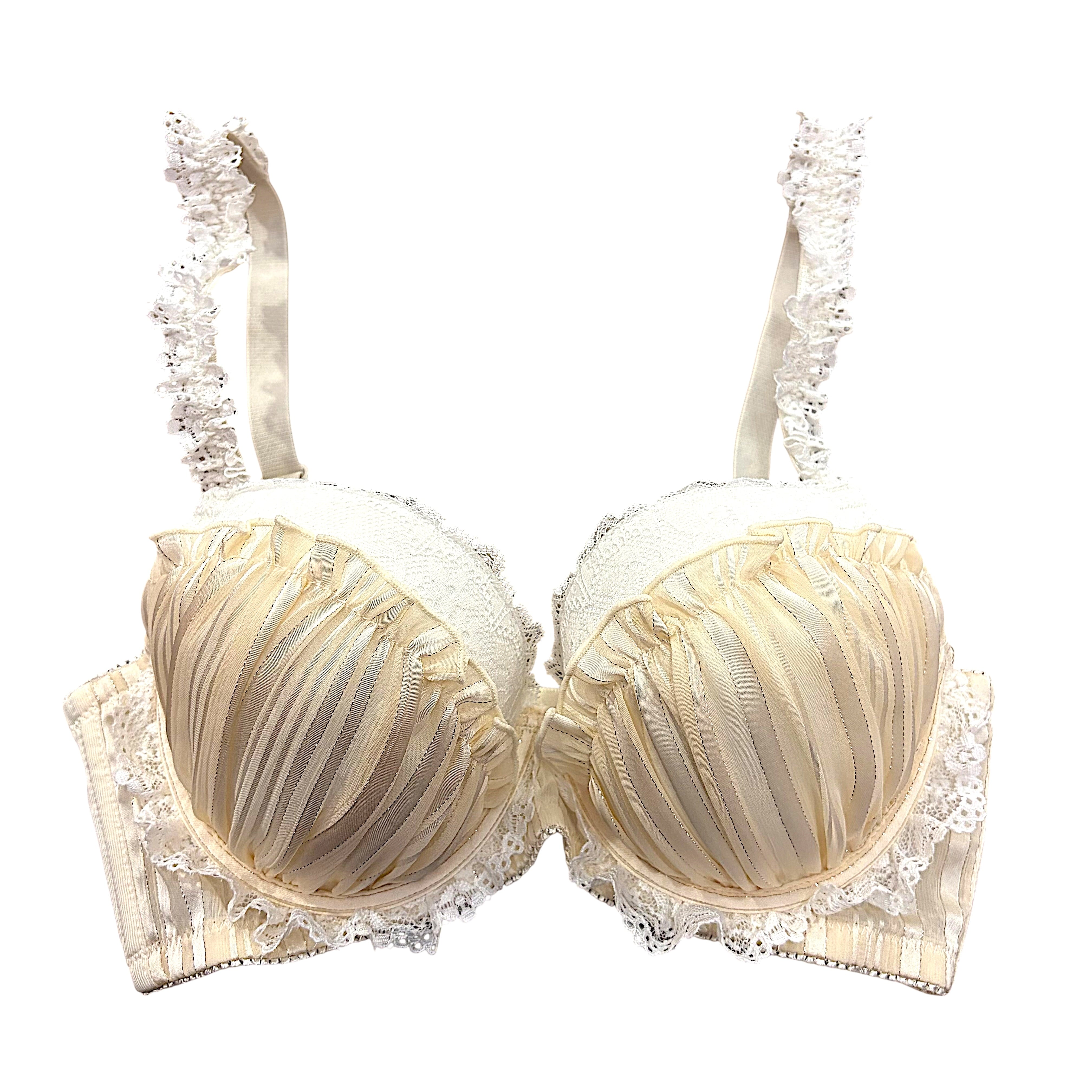 繊細なフリルとレースをあしらったデザインが、胸元をふんわり包み込み自然なボリュームアップを叶えます。立体カップ構造で美しい丸みをキープし、幅広ストラップが安定感をサポート。やさしいアイボリーカラーが肌になじみ、デイリーにも特別な日にもぴったり。