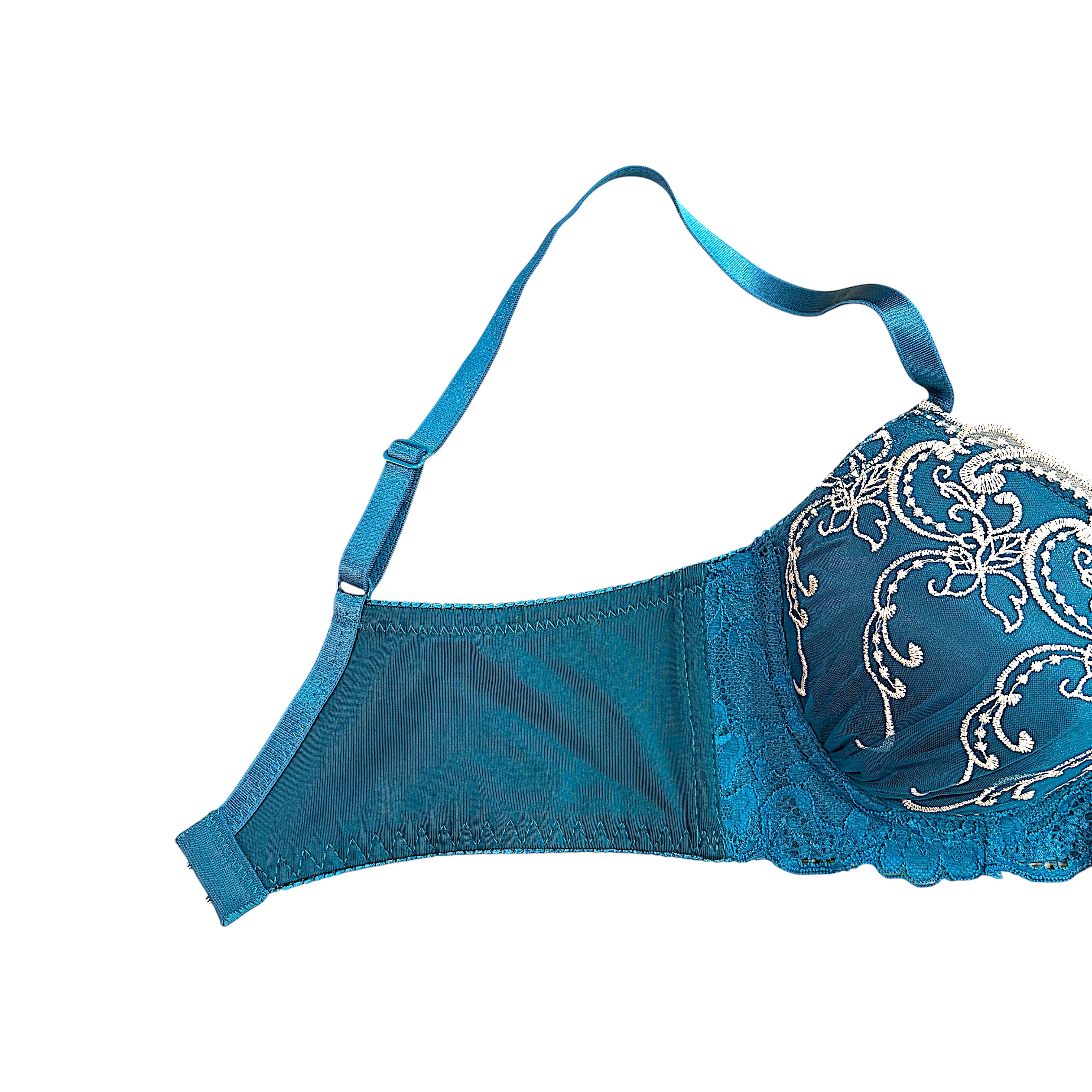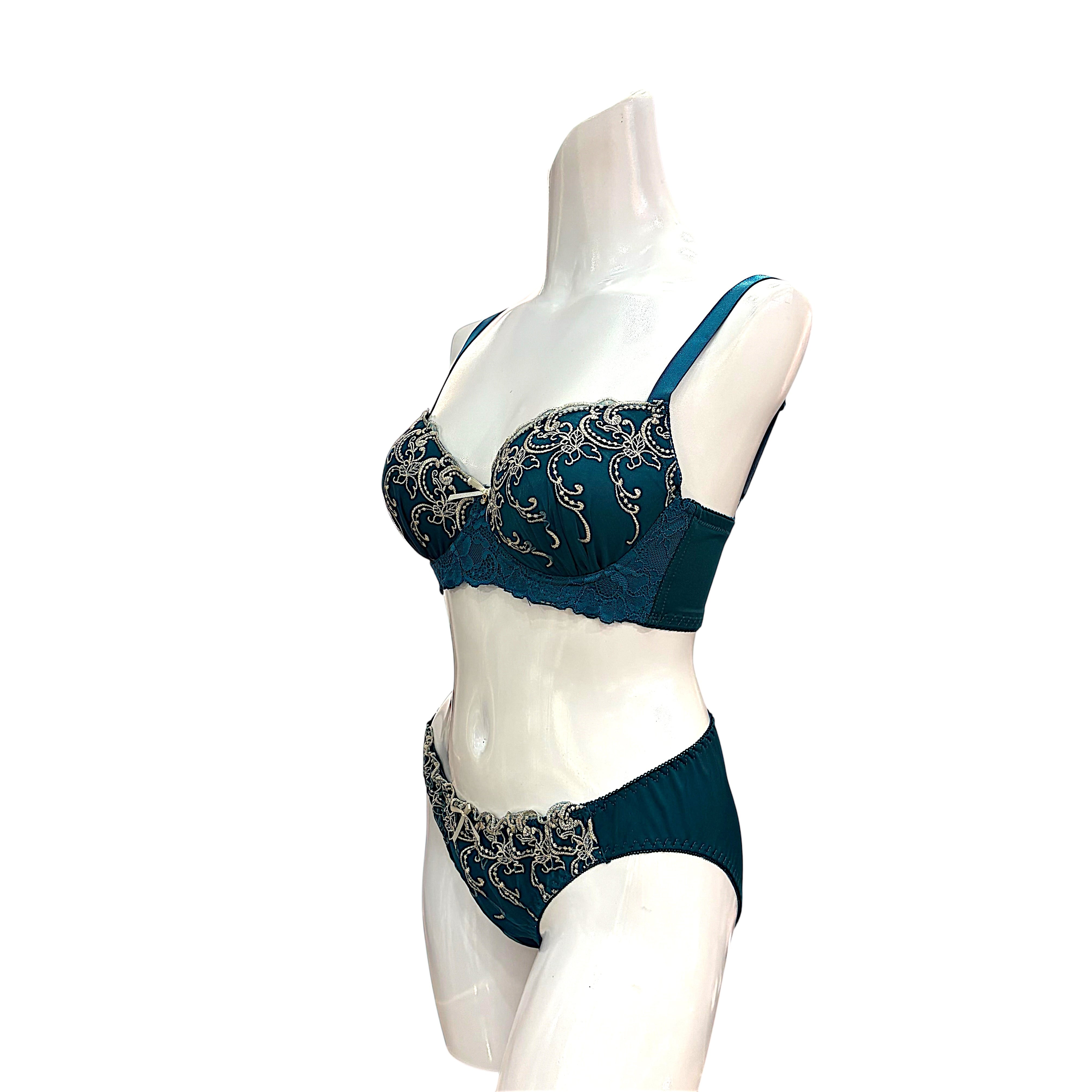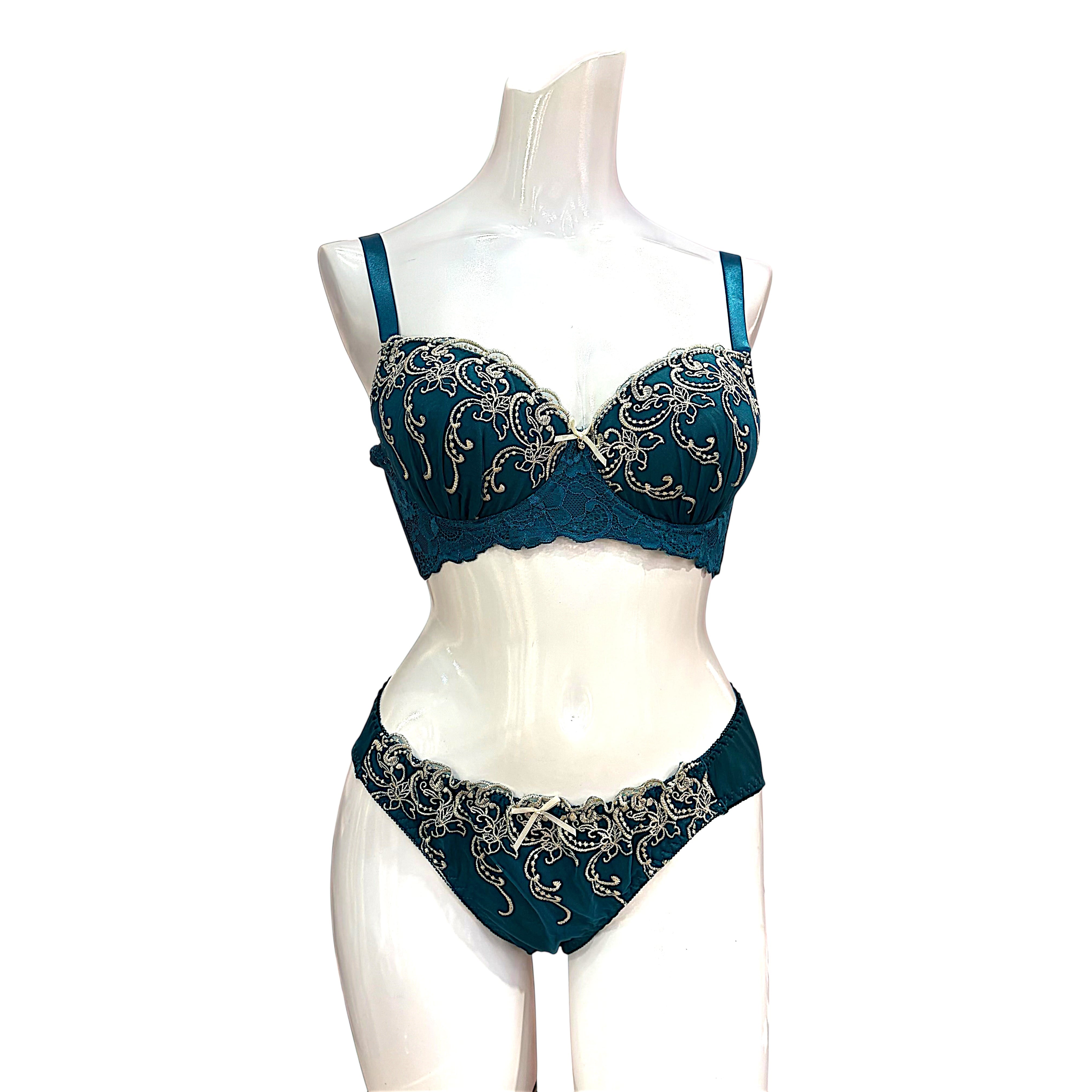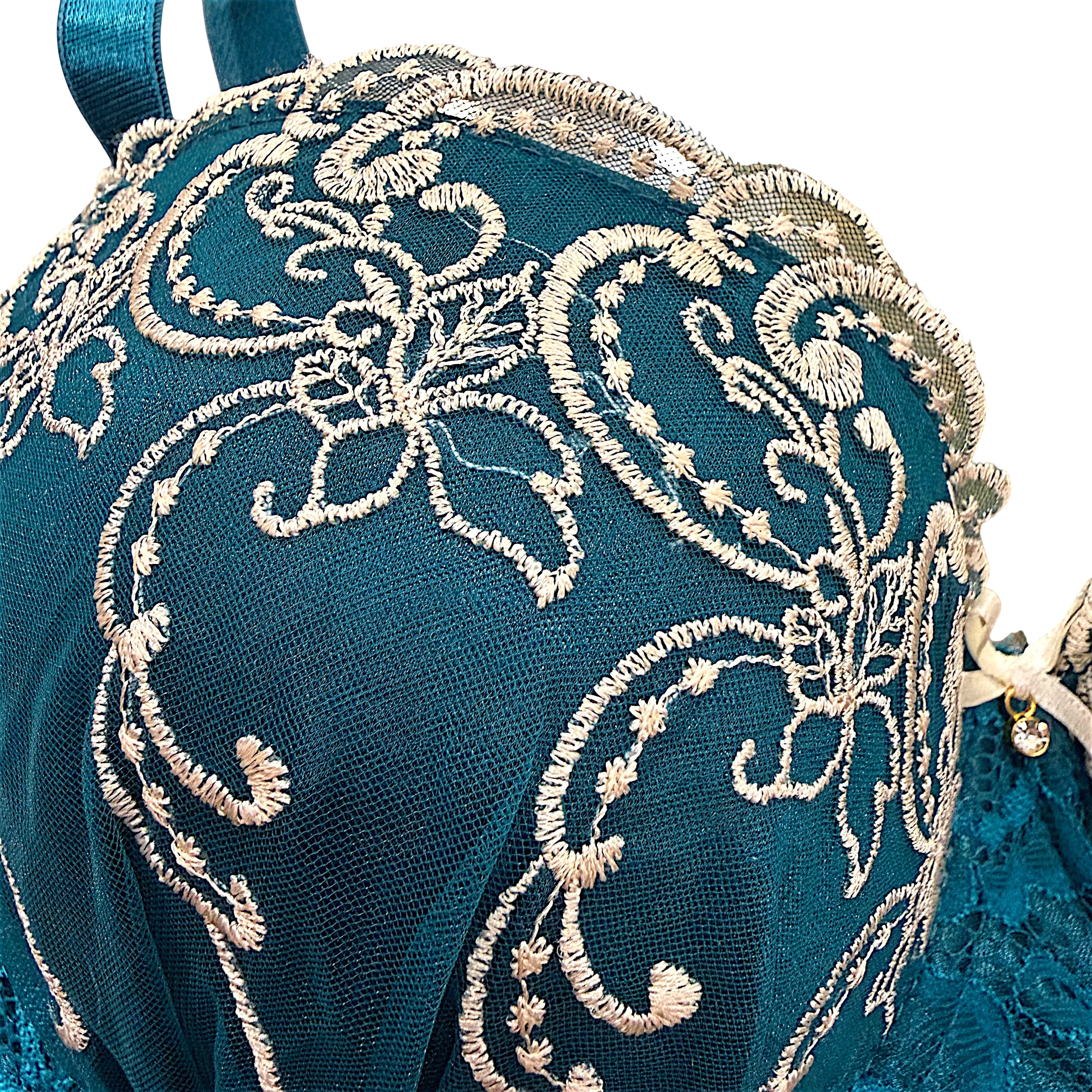 上品さとフィット感を求める方へ、青緑カラーが美しいBCDカップ対応の刺繍レースランジェリーセットです。繊細な刺繍がデコルテを華やかに魅せ、程よい補正力で自然な丸みのあるバストラインを実現。ショーツはなめらかな生地で締め付け感が少なく、デイリーにも特別な日にも快適に着用できます。深みのある色味が大人の魅力を引き立て、レースの美しさを存分に楽しめる一着。安心感のある着け心地と高見えデザインで、リピーターにも好評のランジェリーです。