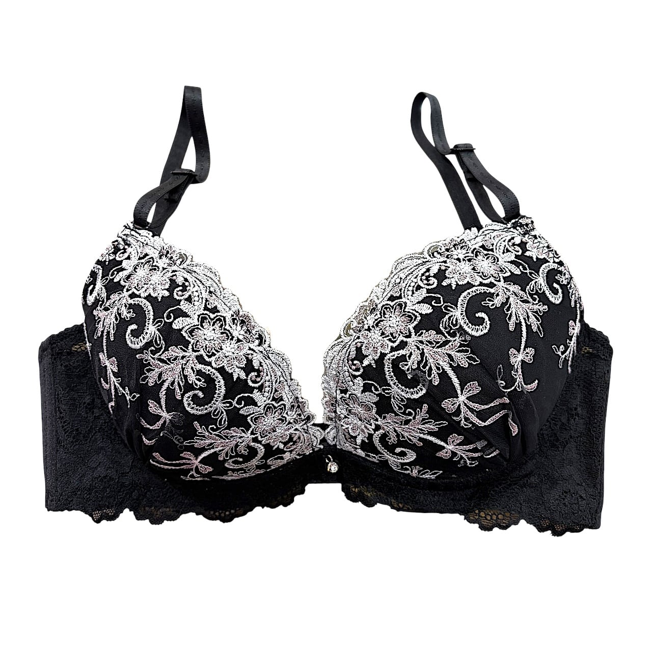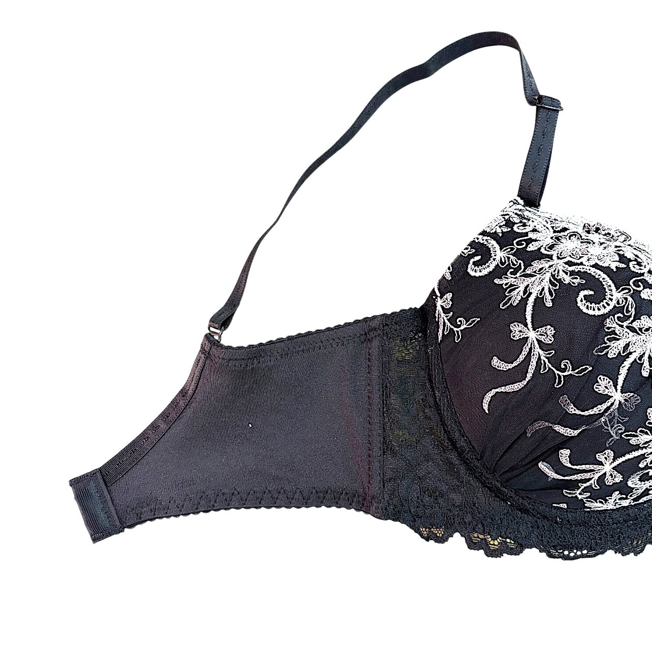 自然な丸みをつくりながら、美しいラインに整えたいB・C・Dカップの方に向けたブラックランジェリーセットです。黒地に華やかな刺繍レースを重ねたデザインが高級感を演出し、胸元をすっきり魅せるカップ構造でデコルテをきれいに見せてくれます。軽い着け心地でもしっかりフィットし、デイリーにも特別な日にも活躍。ショーツは伸縮性が高く、動いても快適さが続く柔らかな生地を使用しています。上品さと使いやすさのバランスがよく、美しさと着け心地を両立したい方からも好評のアイテムです。