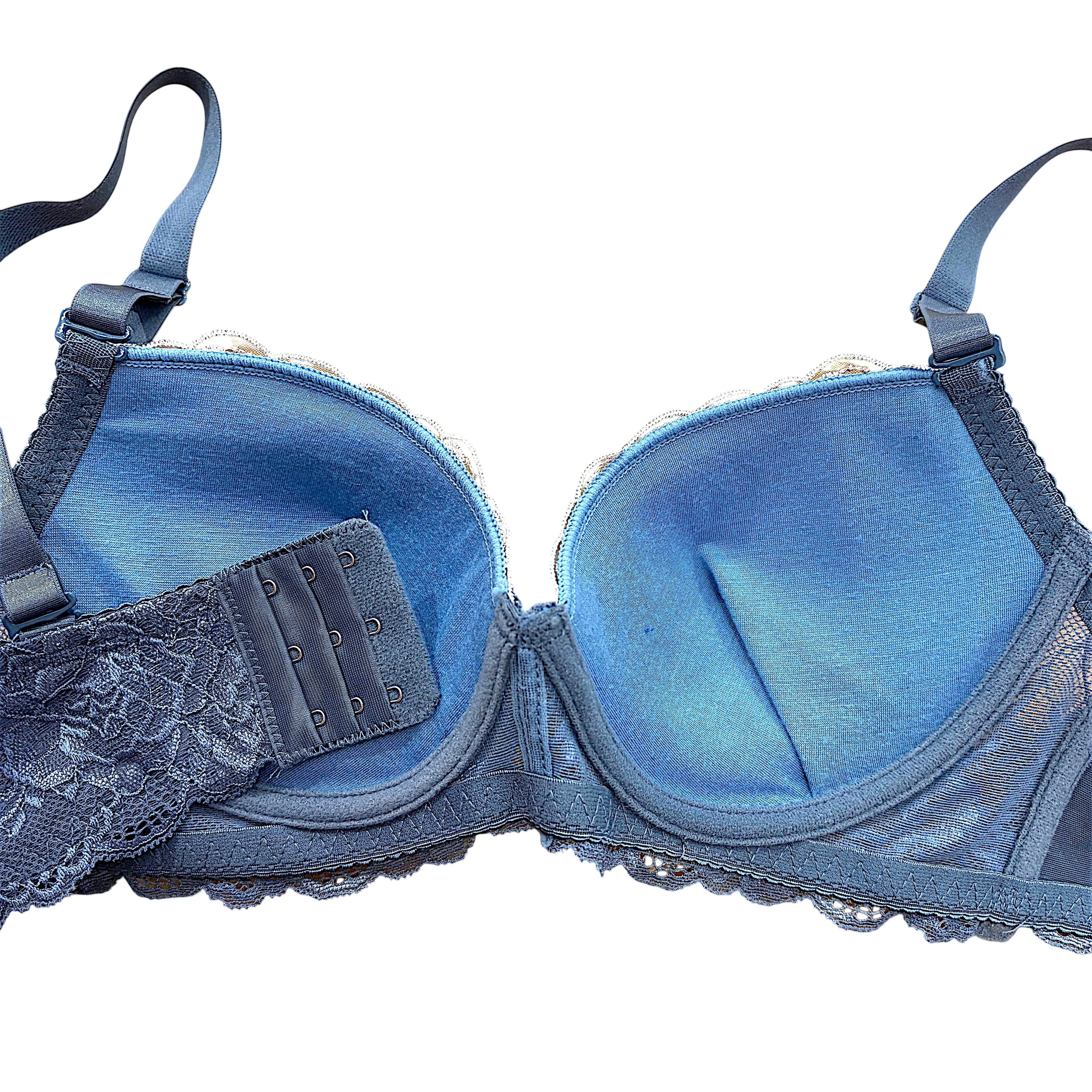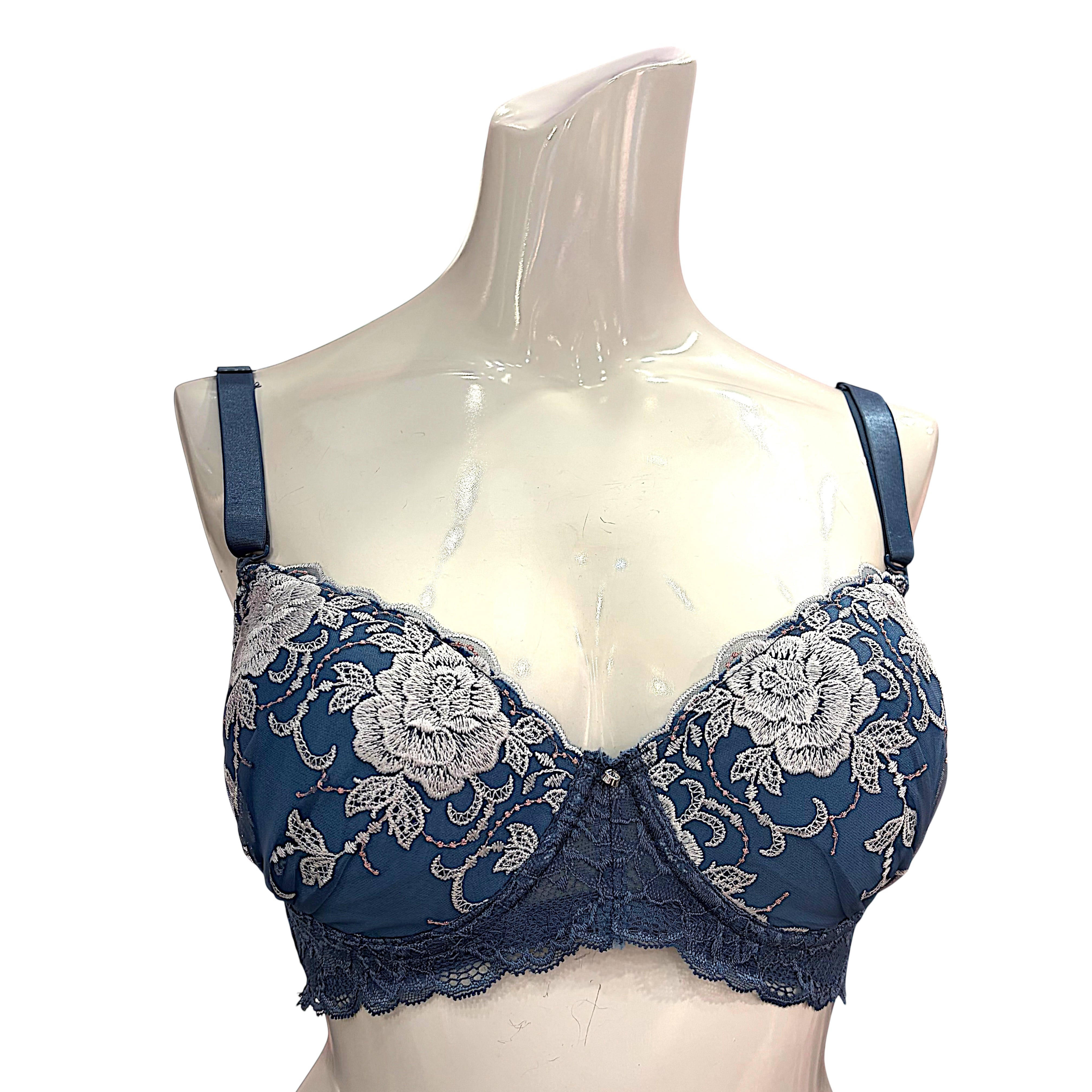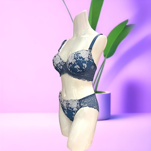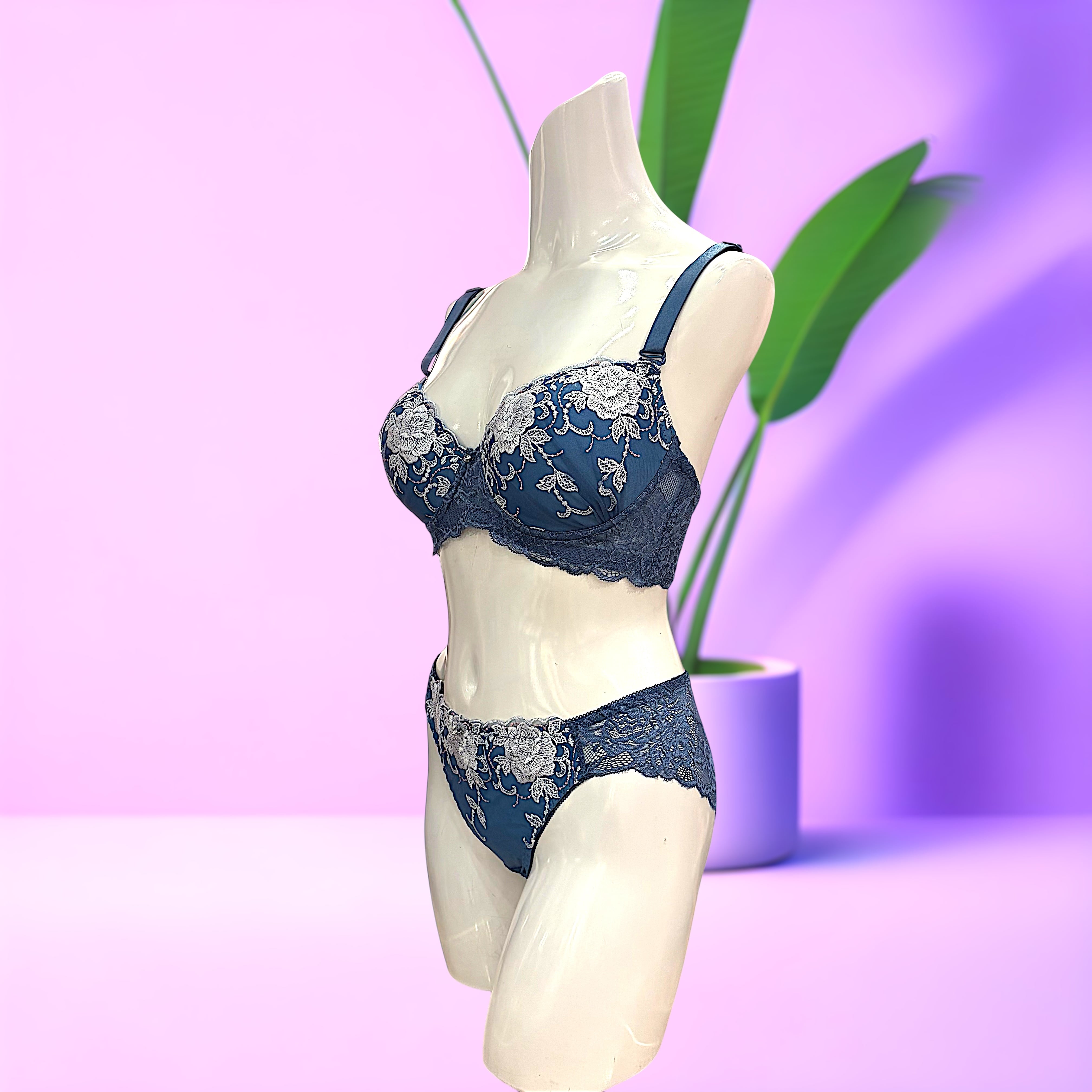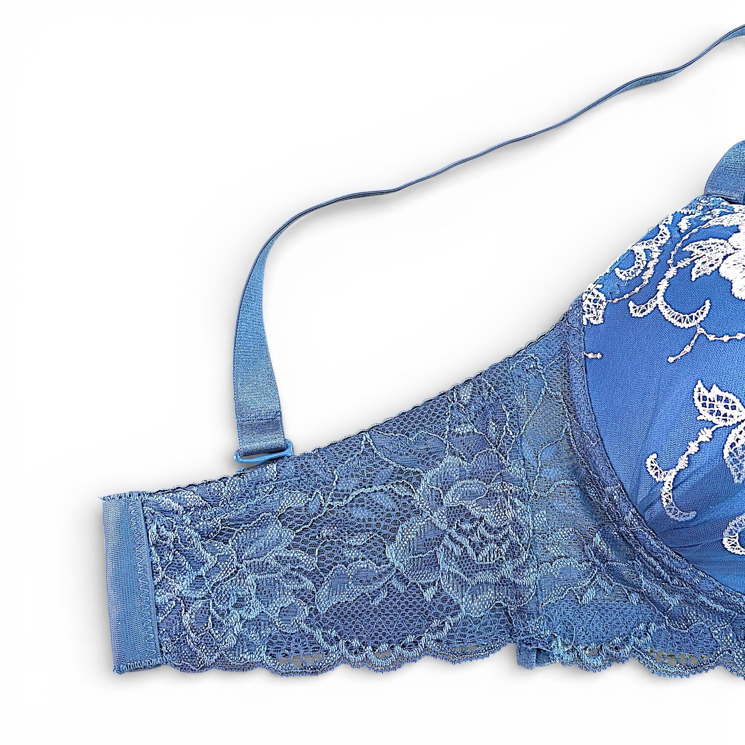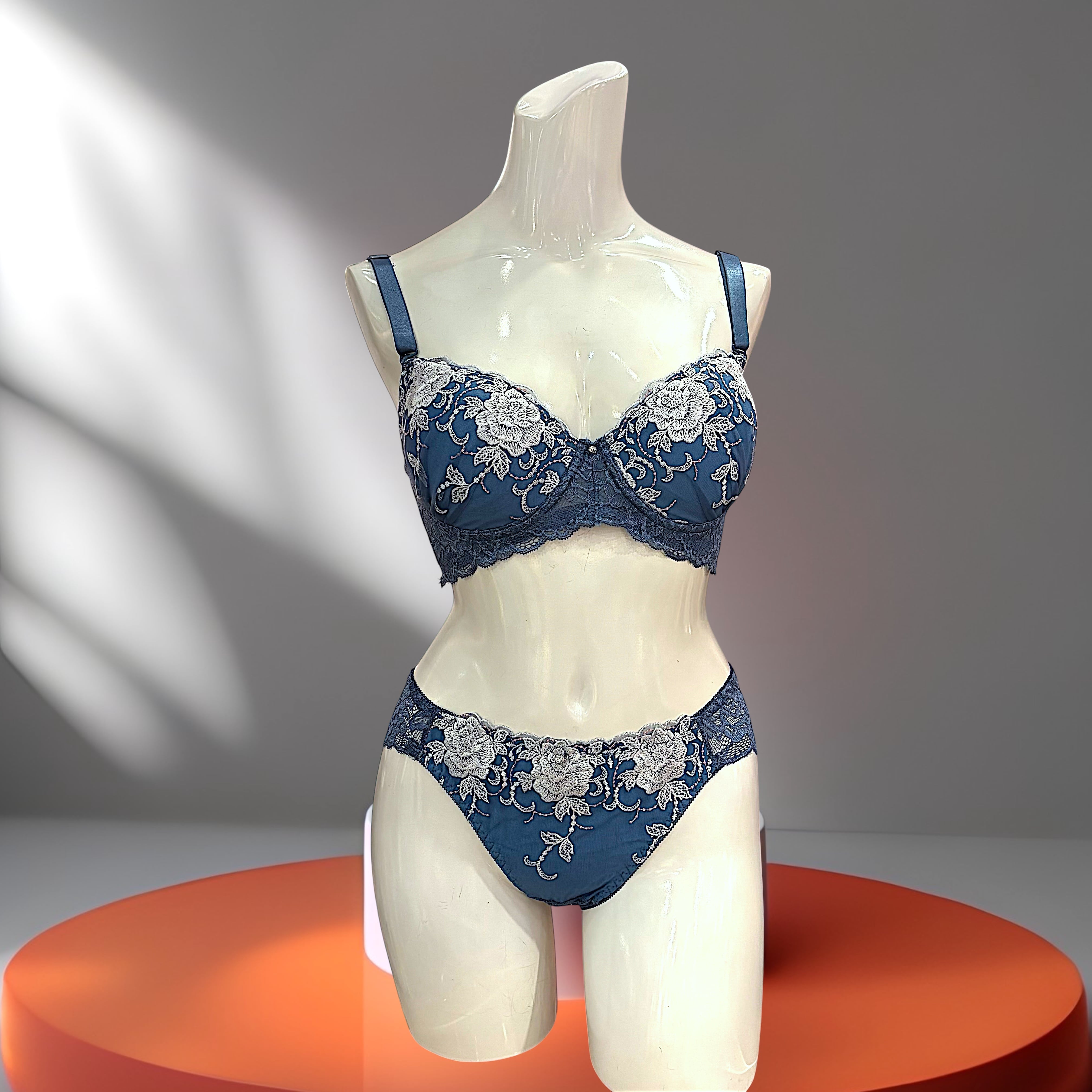 バストが大きく、下着のズレや広がりが気になるEFカップの方に向けた、上品なブルーカラーのブラショーツセットです。繊細なレースを全面に使用し、見た目の華やかさと安定感のあるフィットを両立。立体設計のブラがバストを包み込み、自然な高さと美しいラインをキープします。ショーツはヒップラインに沿う設計で、後ろ姿まで上品な印象に。落ち着きのあるブルーは大人の女性らしさを引き立て、普段使いから特別な日まで幅広く活躍。肌あたりのやさしい素材で長時間着用も安心です。「大きめでも安定する」「色味がきれい」といったレビューも多く、初めての方にも選ばれています。