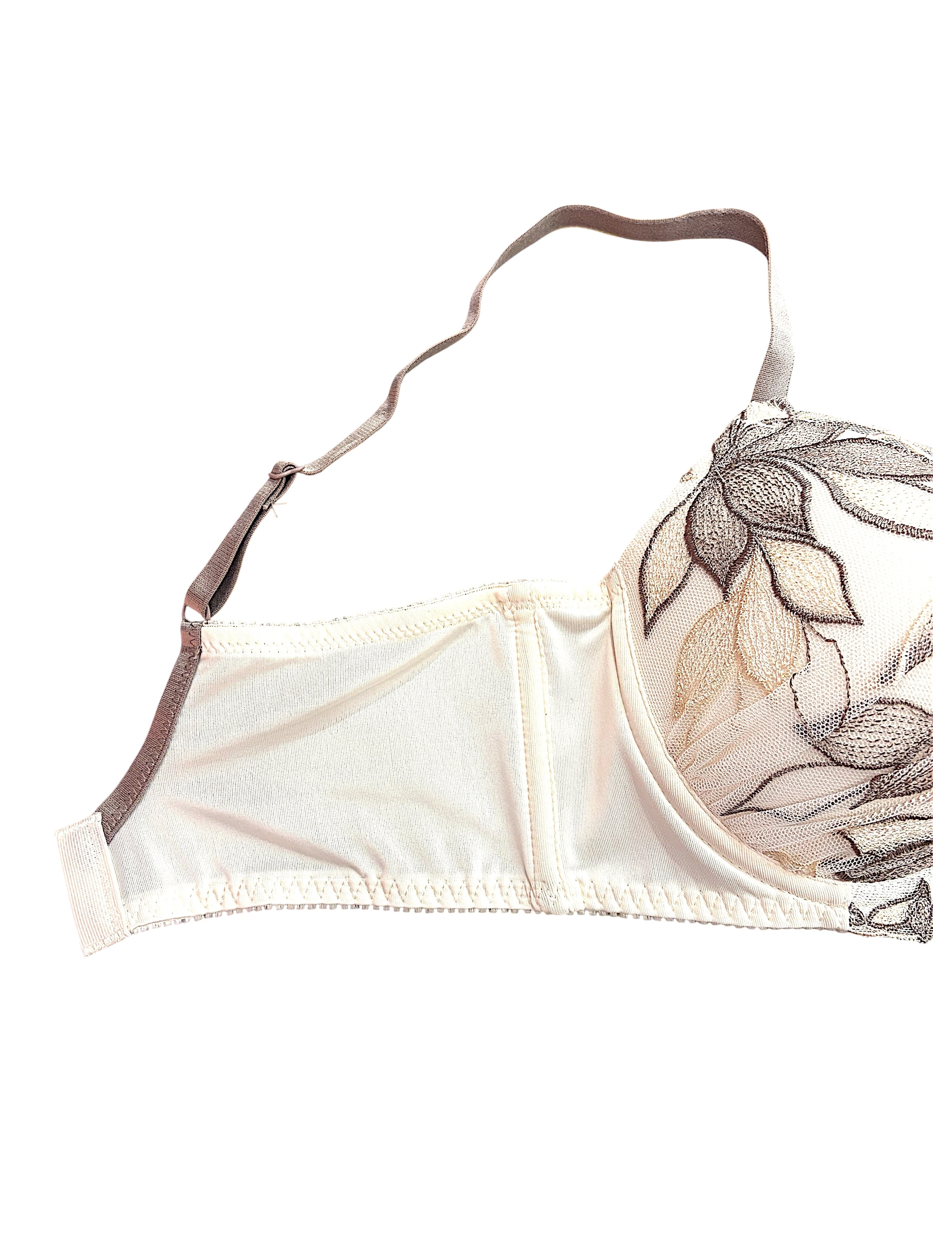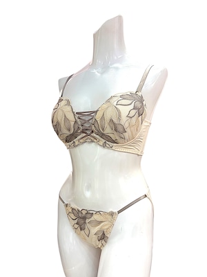 バストのボリューム不足や下垂、脇への横流れが気になる方へ。繊細な花柄レースを贅沢に使用したブラセットは、立体カップと脇高設計でやさしく寄せて整え、美しいバストラインと自然な谷間を演出します。肌なじみのよい上品カラーで、アウターに響きにくいのも魅力。デイリー使いはもちろん、特別な日のおしゃれインナーとしても活躍します。締めつけ感を抑えた快適な着け心地と安定感が好評で、長時間でも安心して着用できるとレビューでも評価の高いランジェリーです。