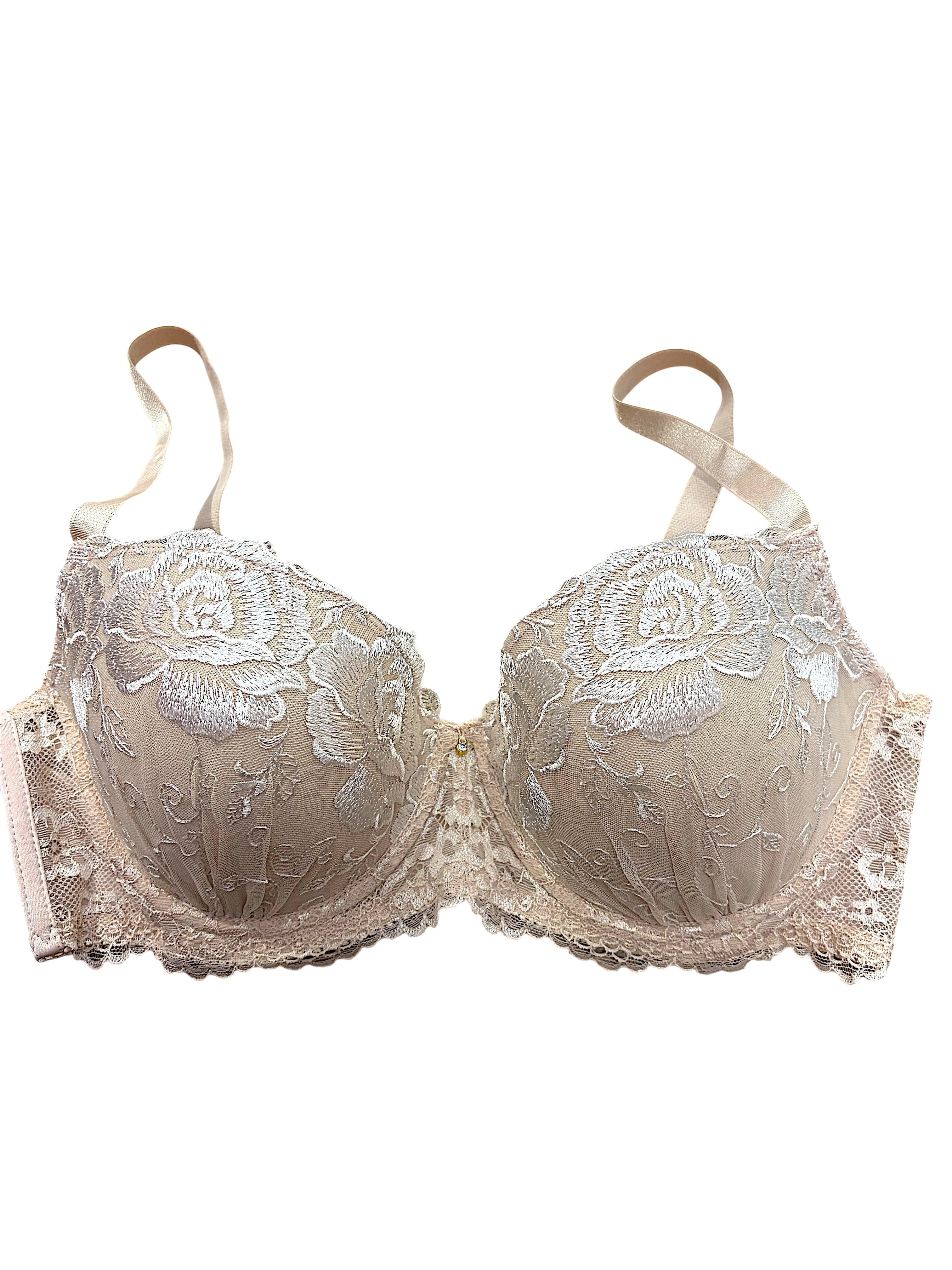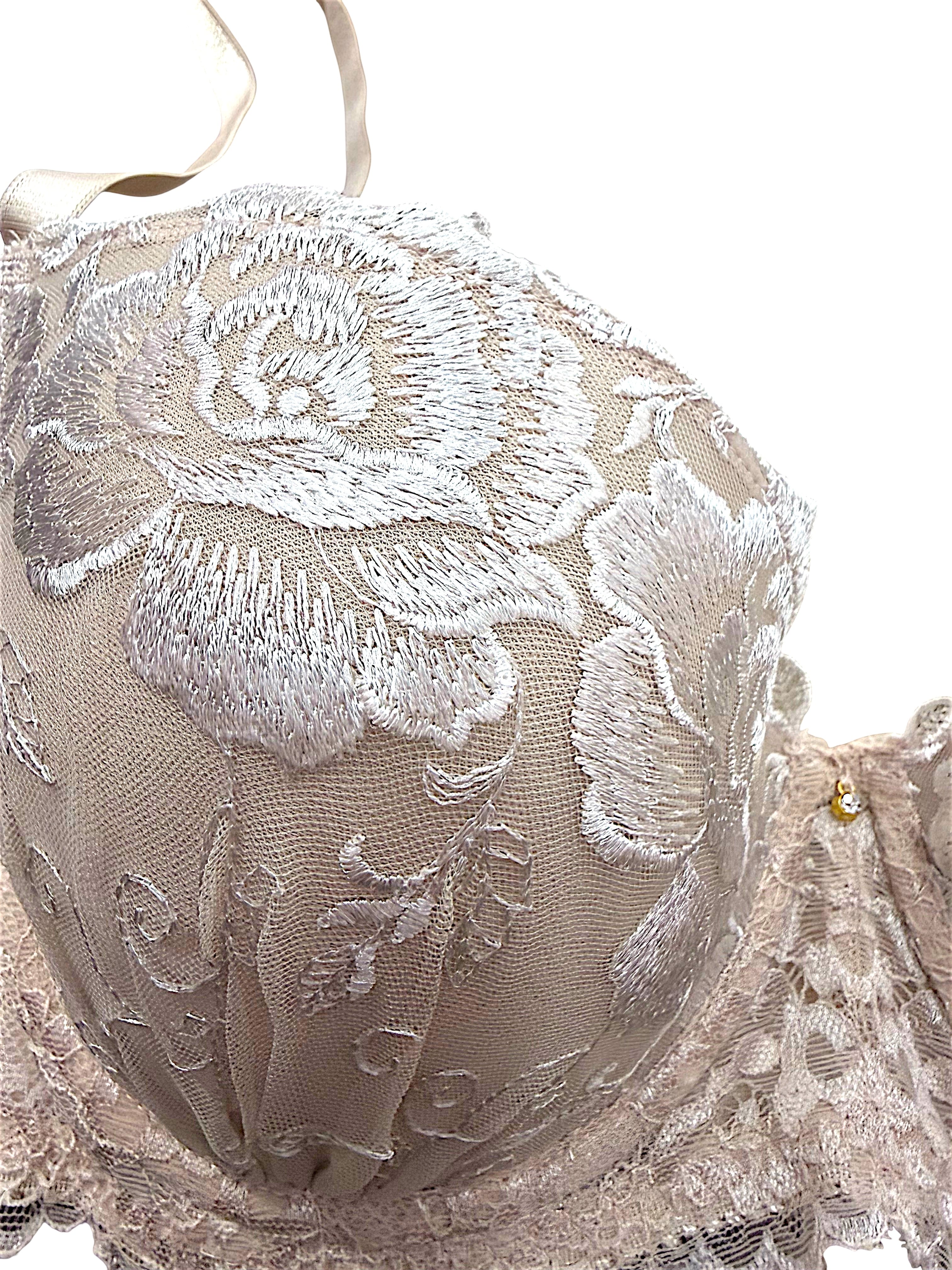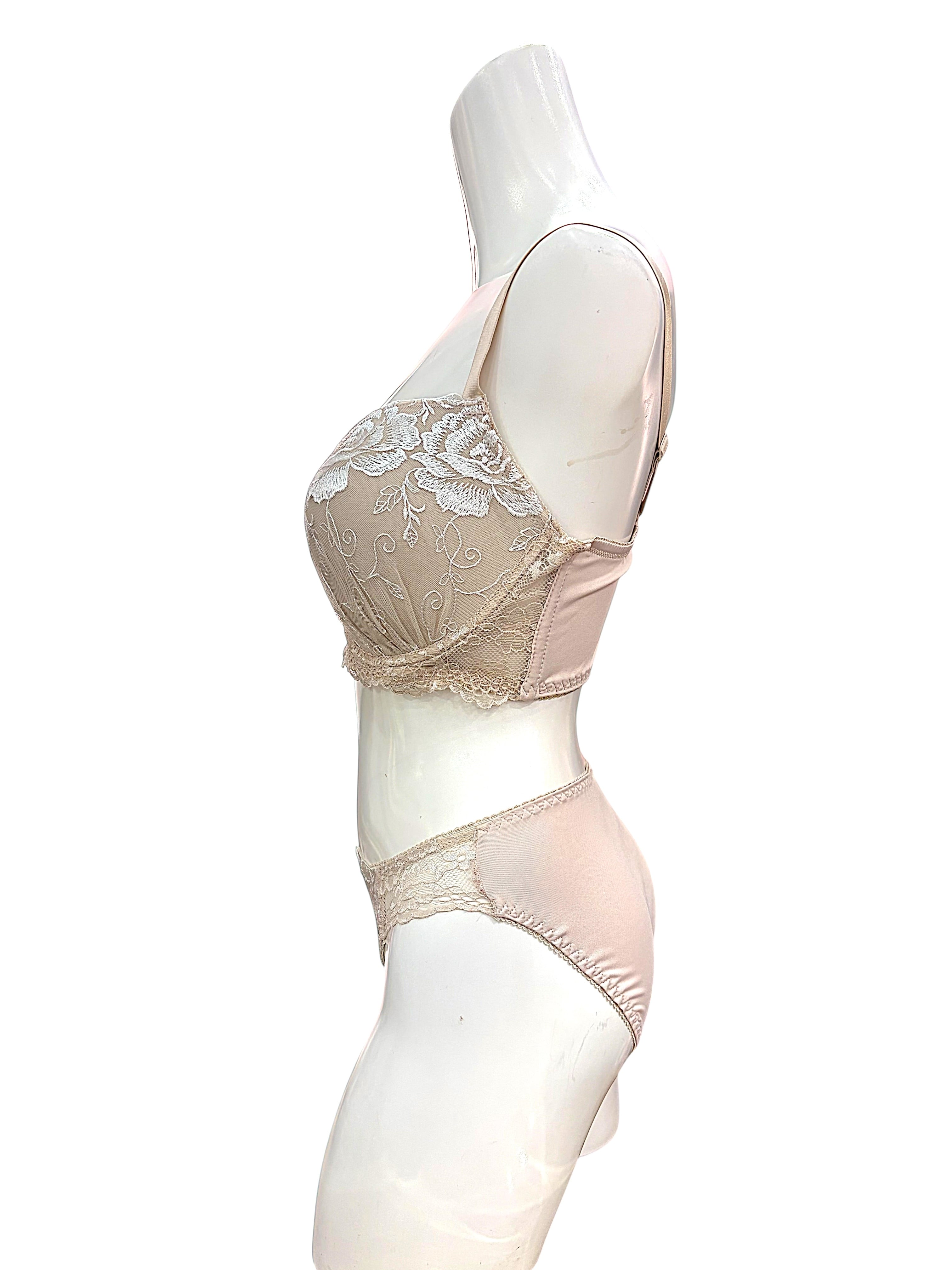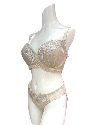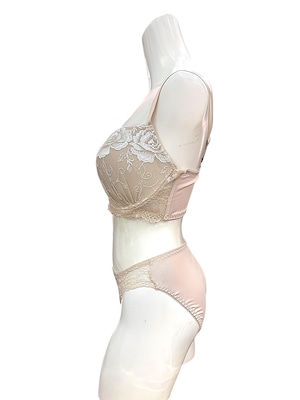 派手すぎるデザインは避けたいけれど、地味すぎる下着では物足りない…そんな方におすすめのブラセット。アイボリーに白のバラ刺繍をあしらった上品なデザインで、肌なじみがよく普段使いに最適です。立体カップがバストをやさしく包み込み、自然な丸みときれいなバストラインを演出。脇高設計で横流れを防ぎ、安定感のある着け心地を実現しました。デイリー使いはもちろん、オフィスシーンにも活躍。シンプルながら華やかさもあるとレビューでも好評のランジェリーです。