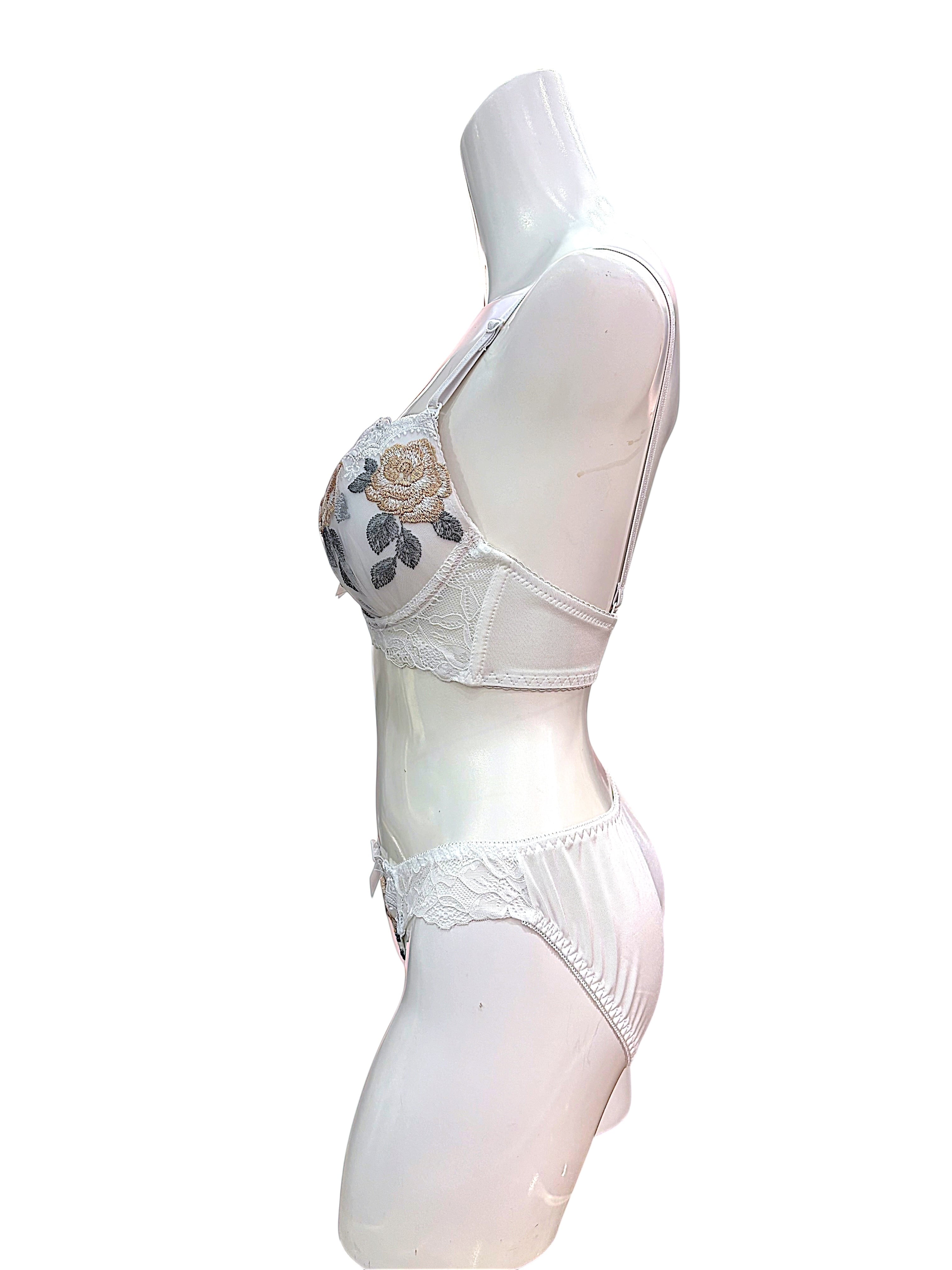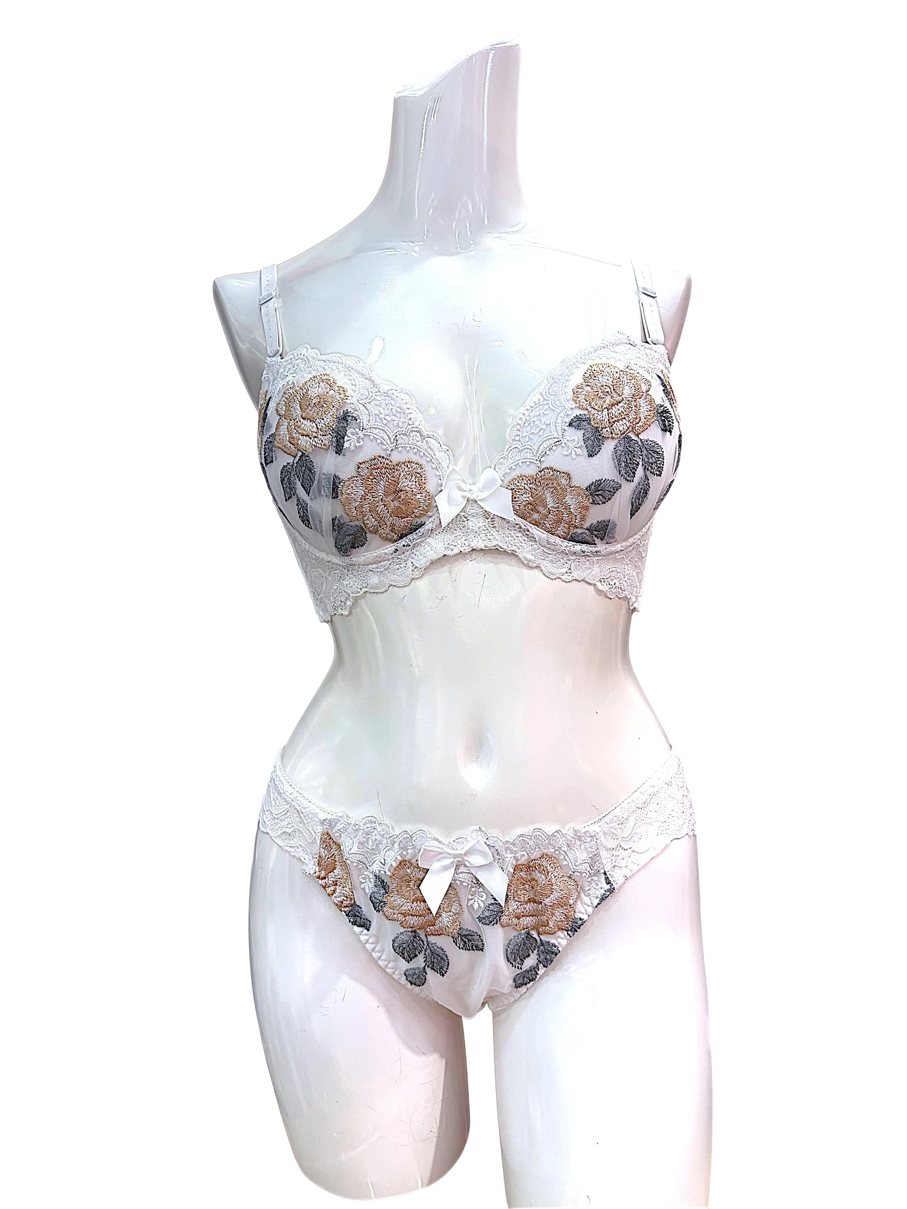 BCD【960800 ホワイト】一目惚れ必至 大柄ローズ刺繍×L字ワイヤーブラ&ショーツセット/ホワイト
