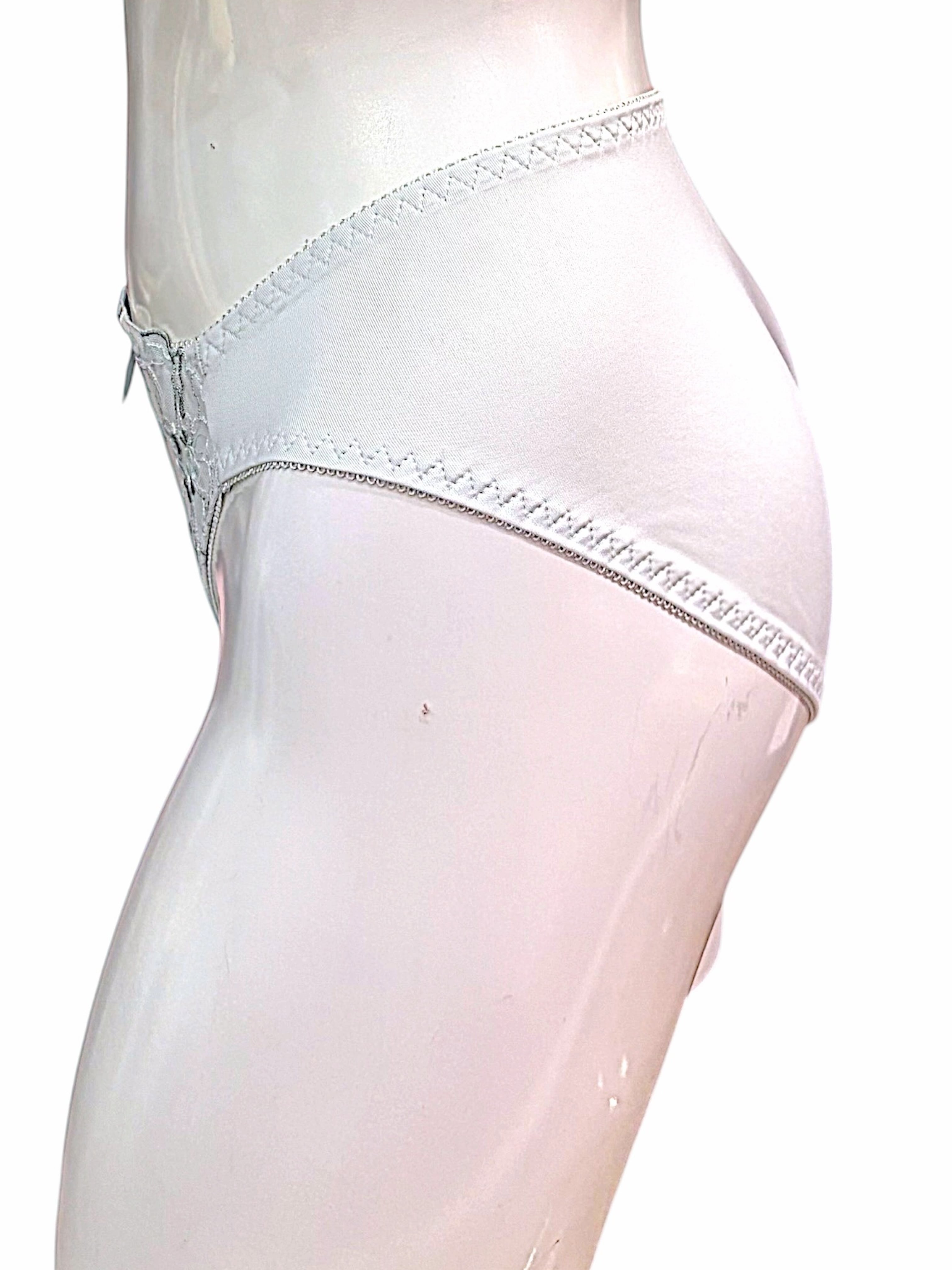 センターの小さなブルーリボンがワンポイントとなり、全体の淡い色調にさりげないアクセントを添えています。ショーツのウエスト部分にも同柄の刺繍を配し、上下を合わせたときの統一感と完成度の高さは折り紙付きです。