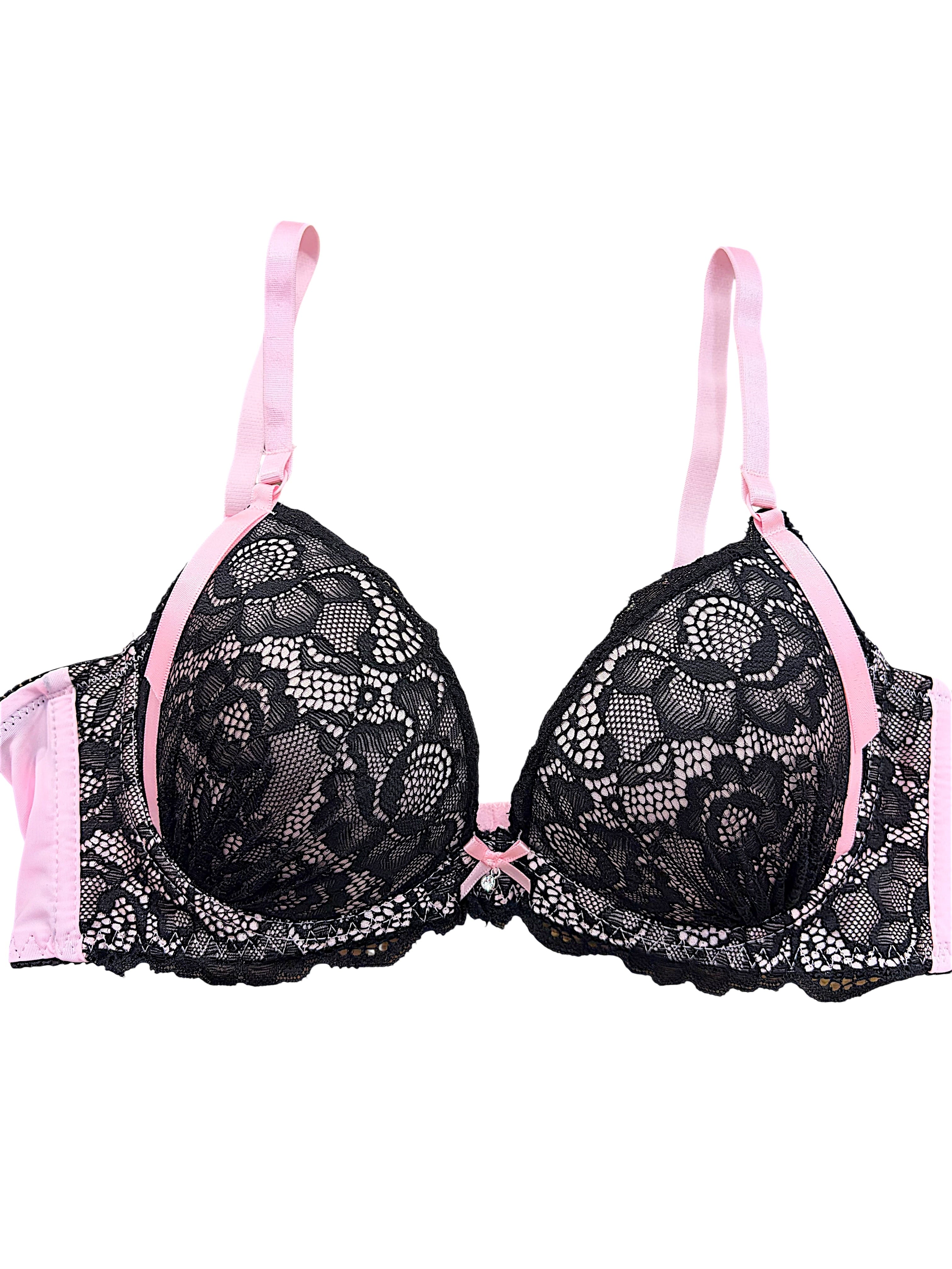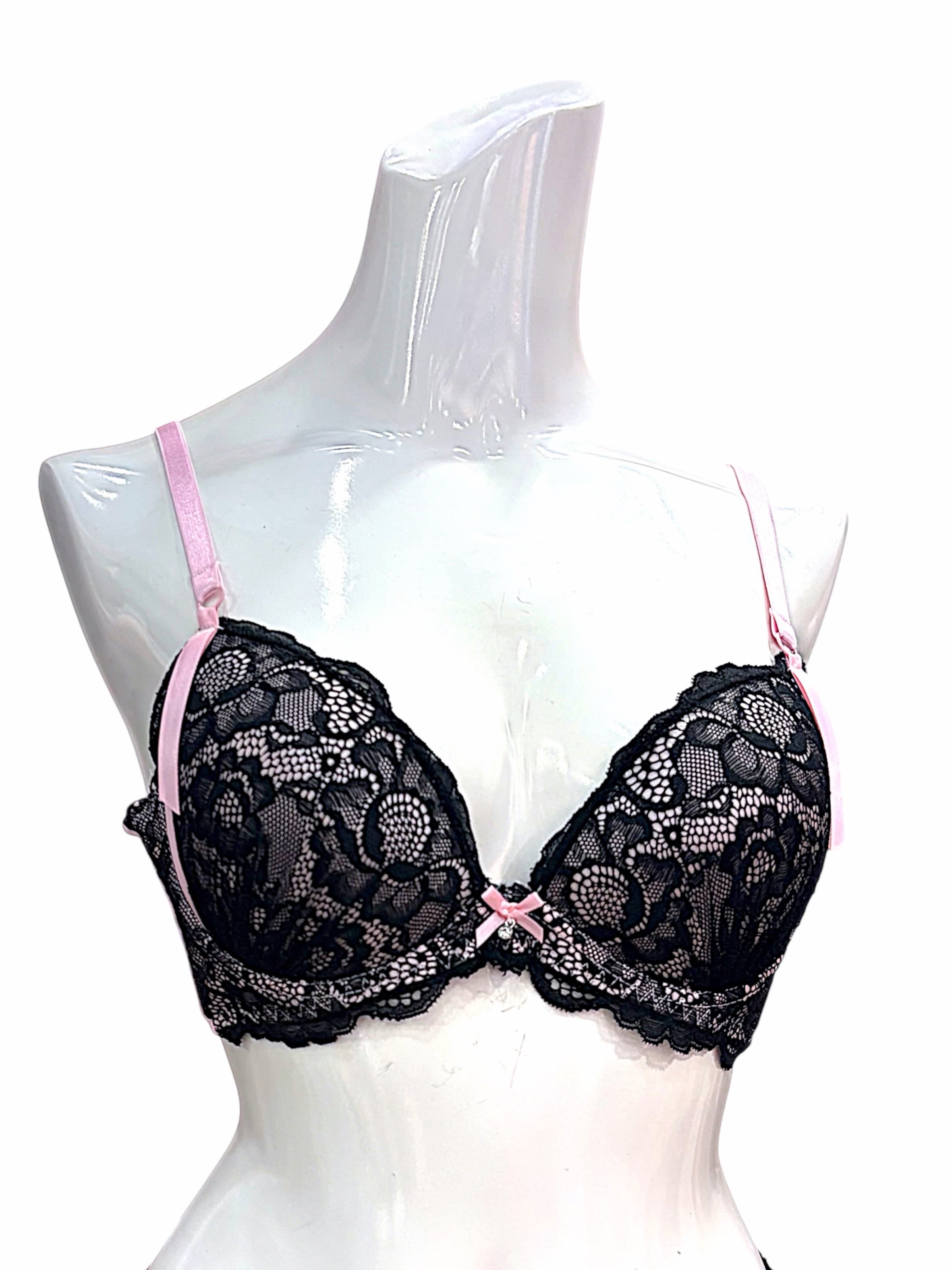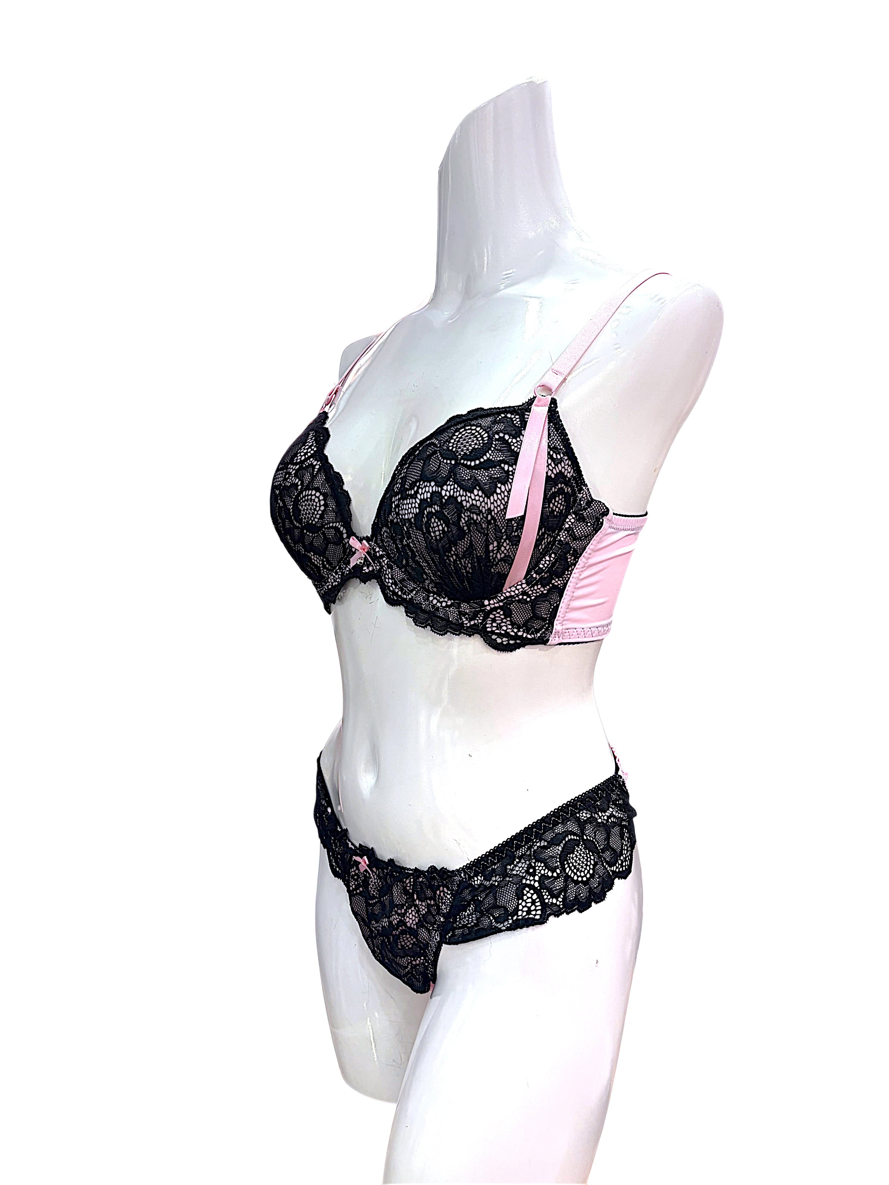 ブラックベースにピンクの花柄レースが華やかで大人かわいい印象のブラ&ショーツセット。ふんわりしたフリルレースとセンタービジューがポイント。裏地はピンクで女性らしさを演出。ノンワイヤーで軽い着け心地です。