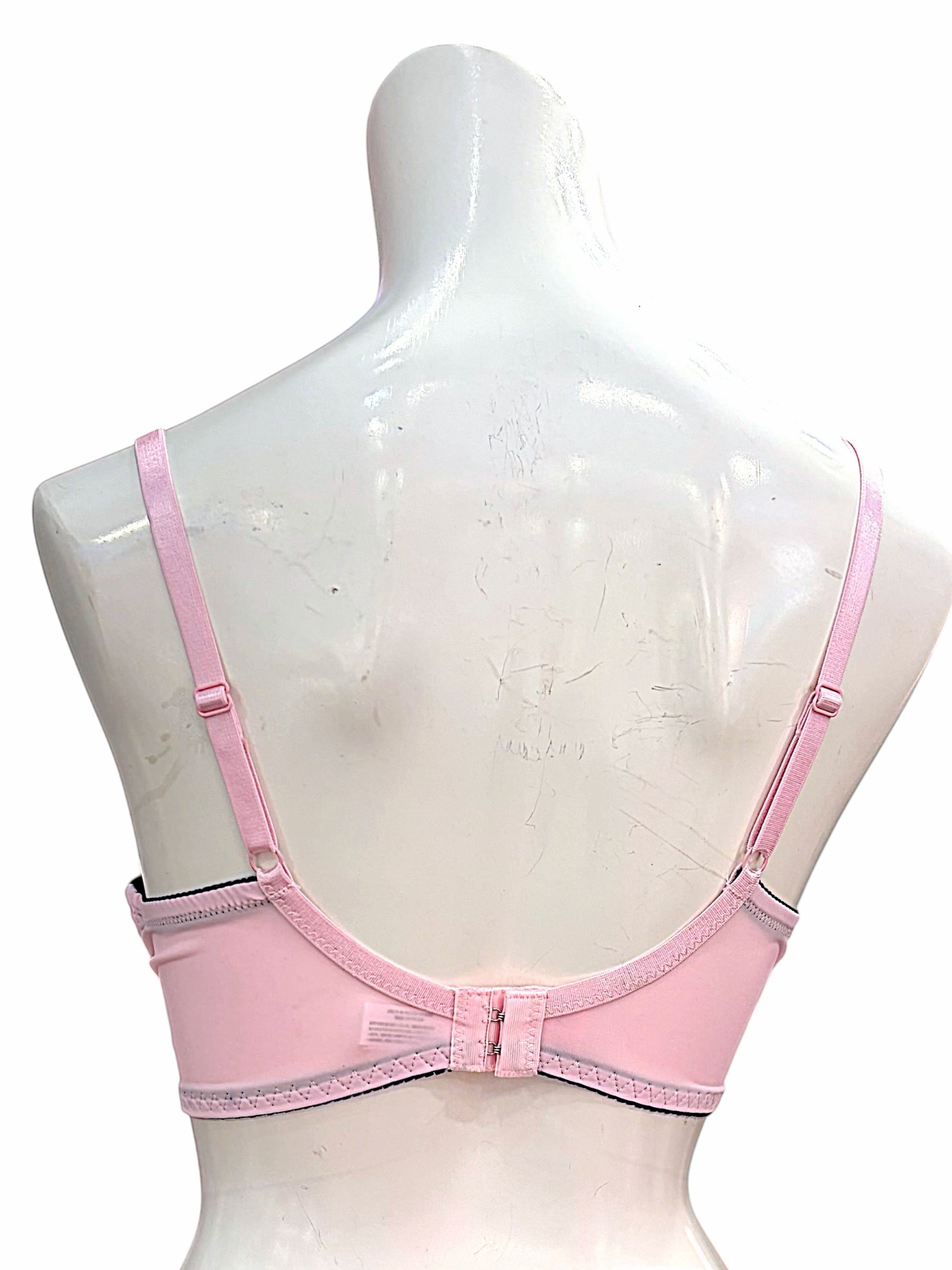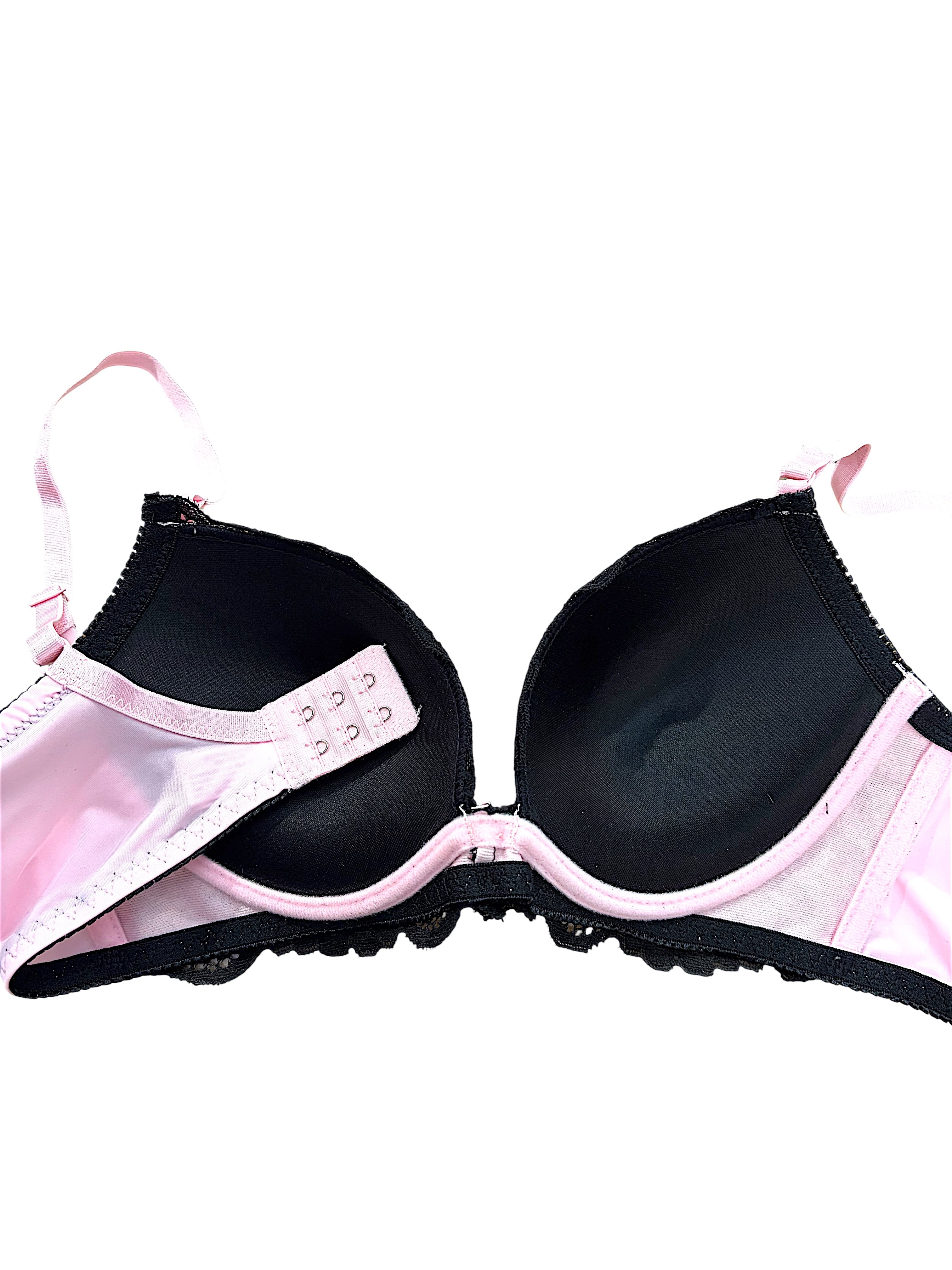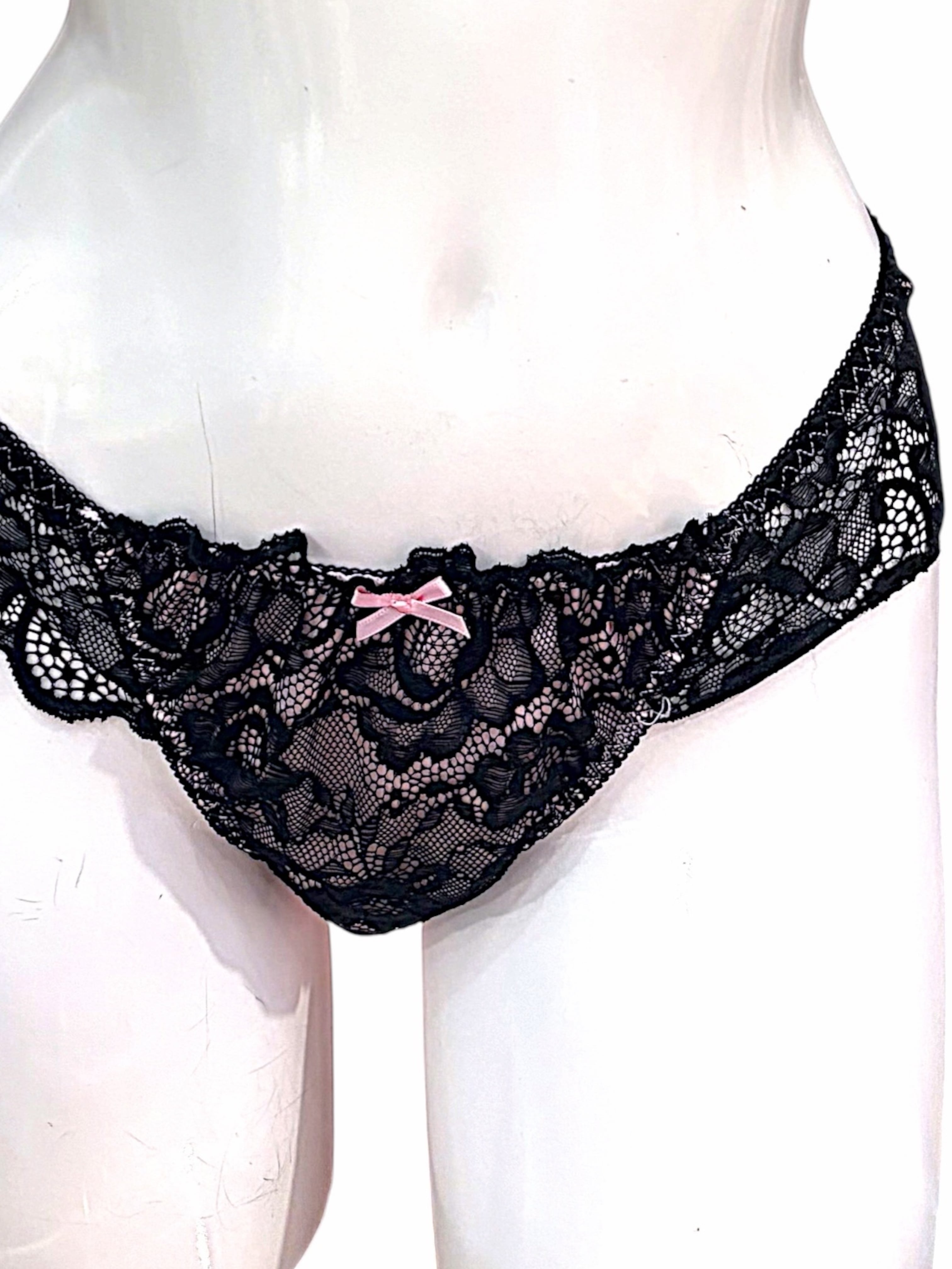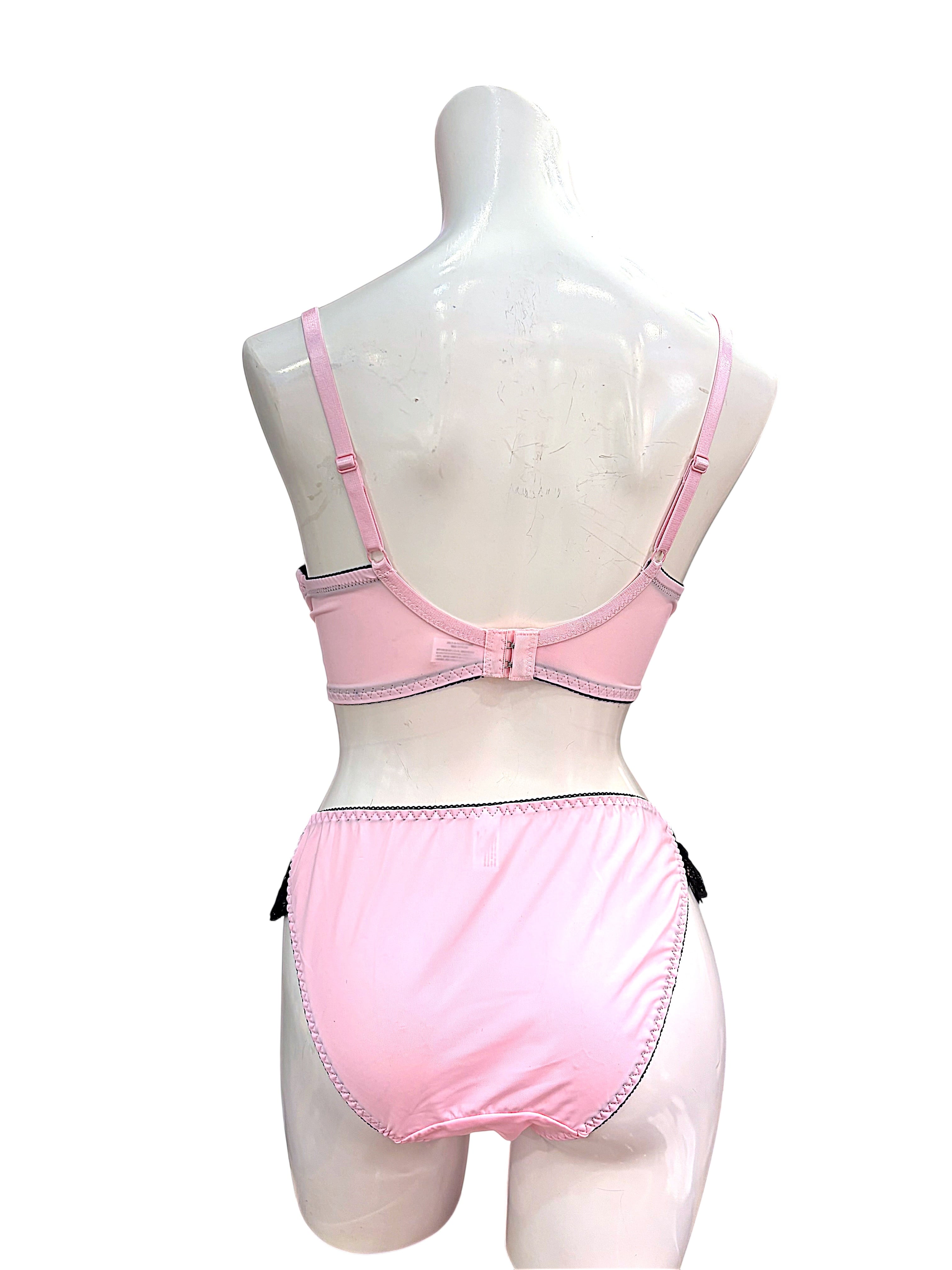 ブラックベースにピンクの花柄レースが華やかで大人かわいい印象のブラ&ショーツセット。ふんわりしたフリルレースとセンタービジューがポイント。裏地はピンクで女性らしさを演出。ノンワイヤーで軽い着け心地です。