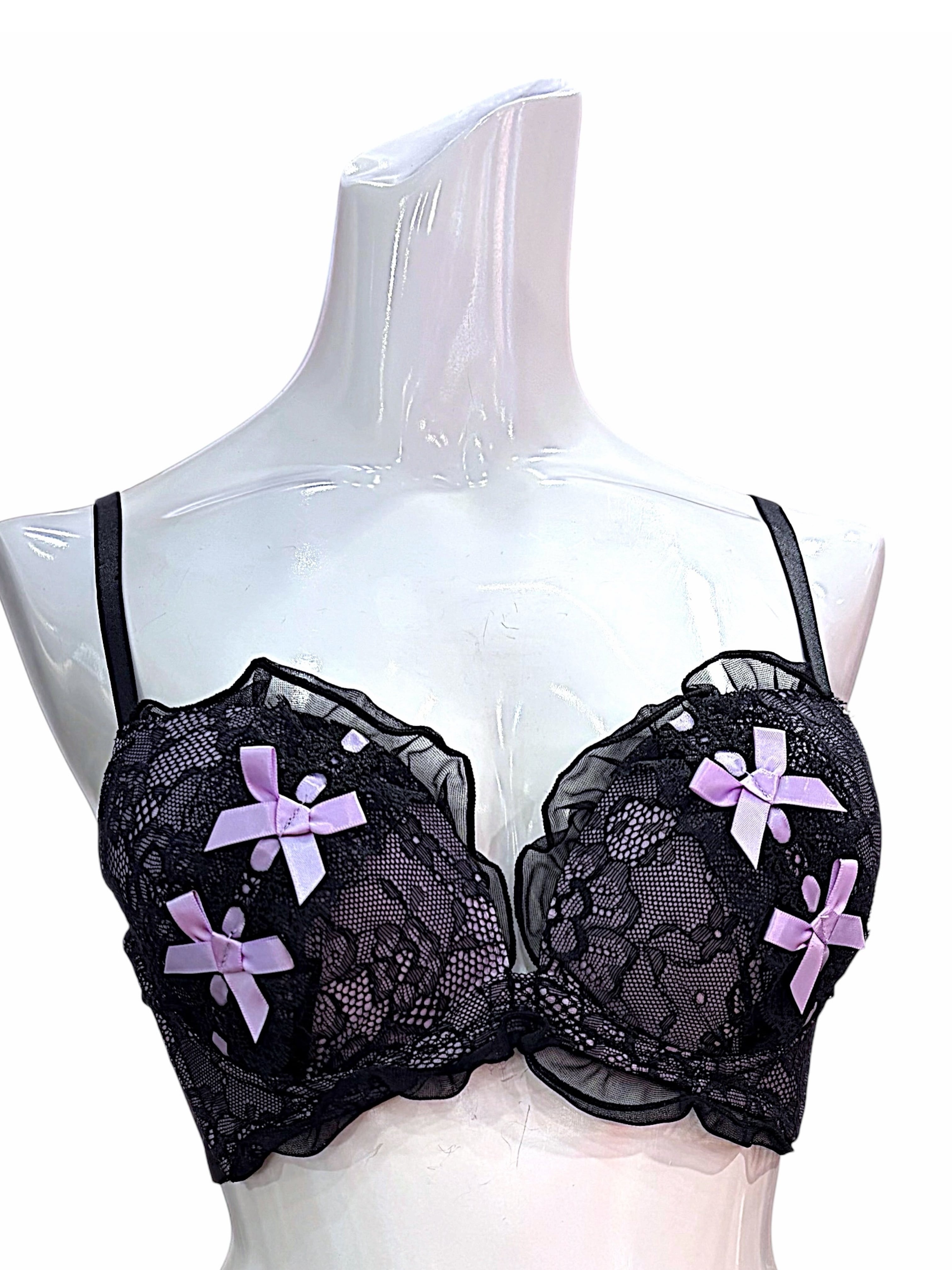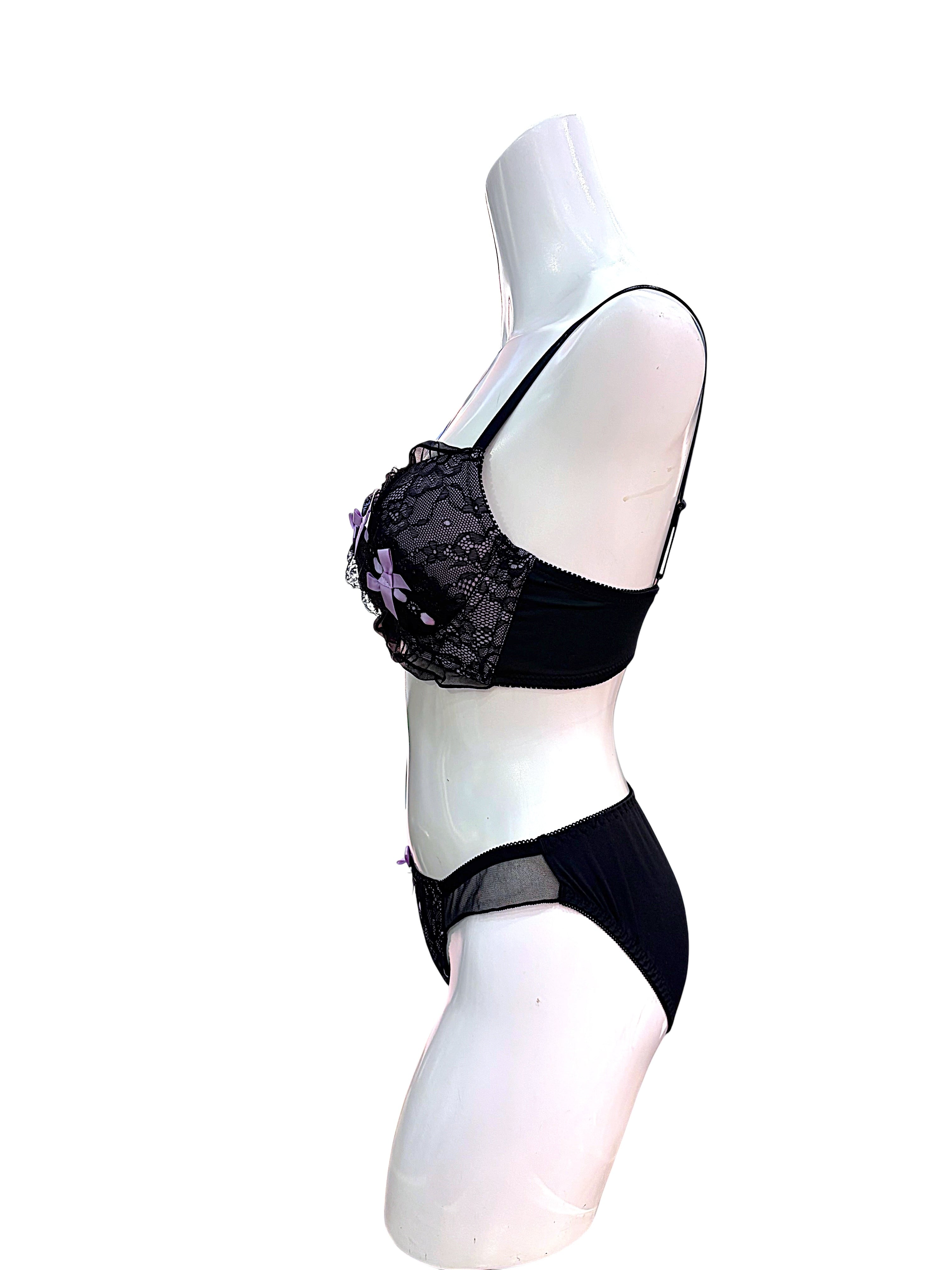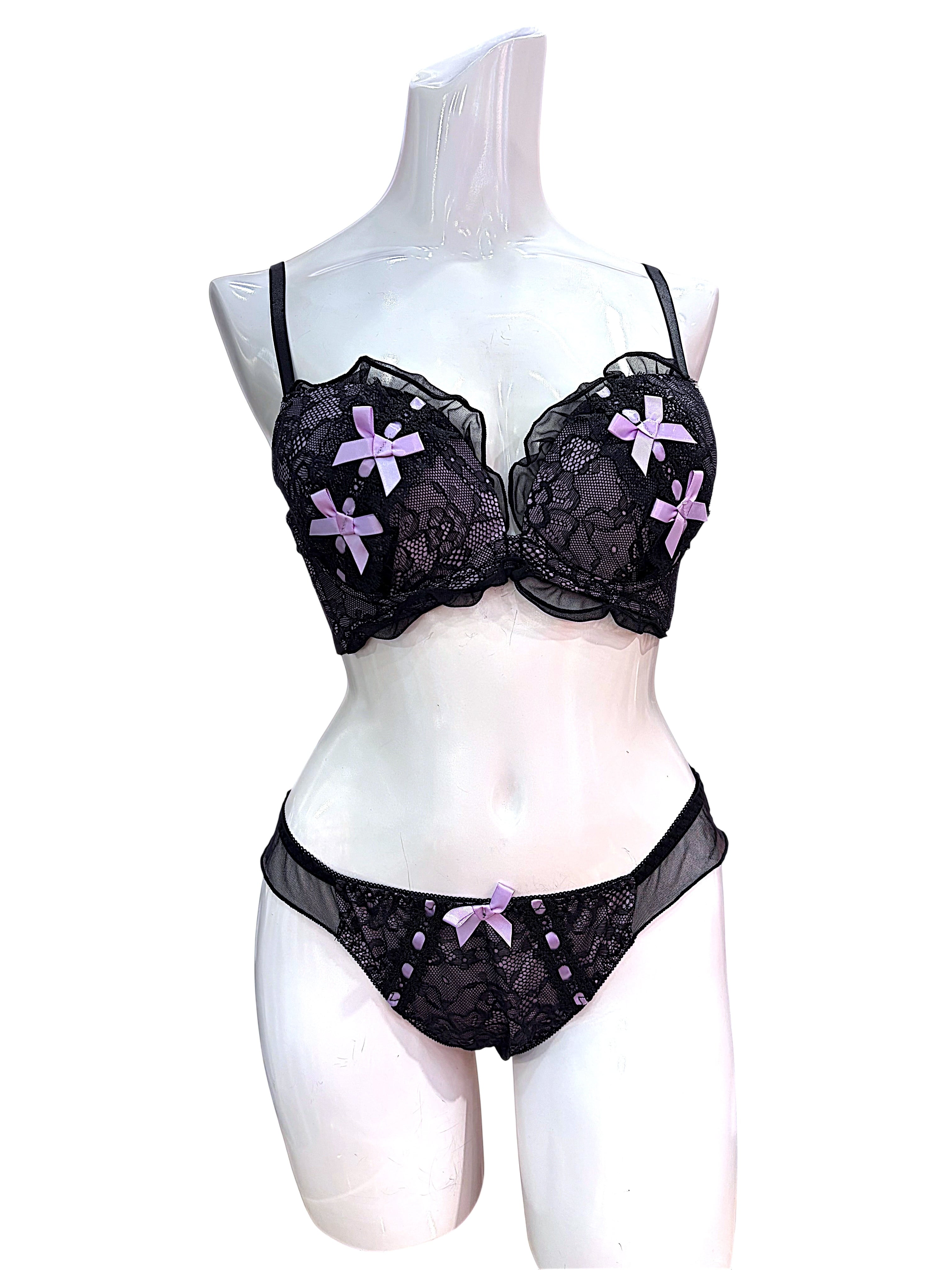 BCD【7000100 ブラック】ブラック×ラベンダーリボン 花柄レースブラ&ショーツセット