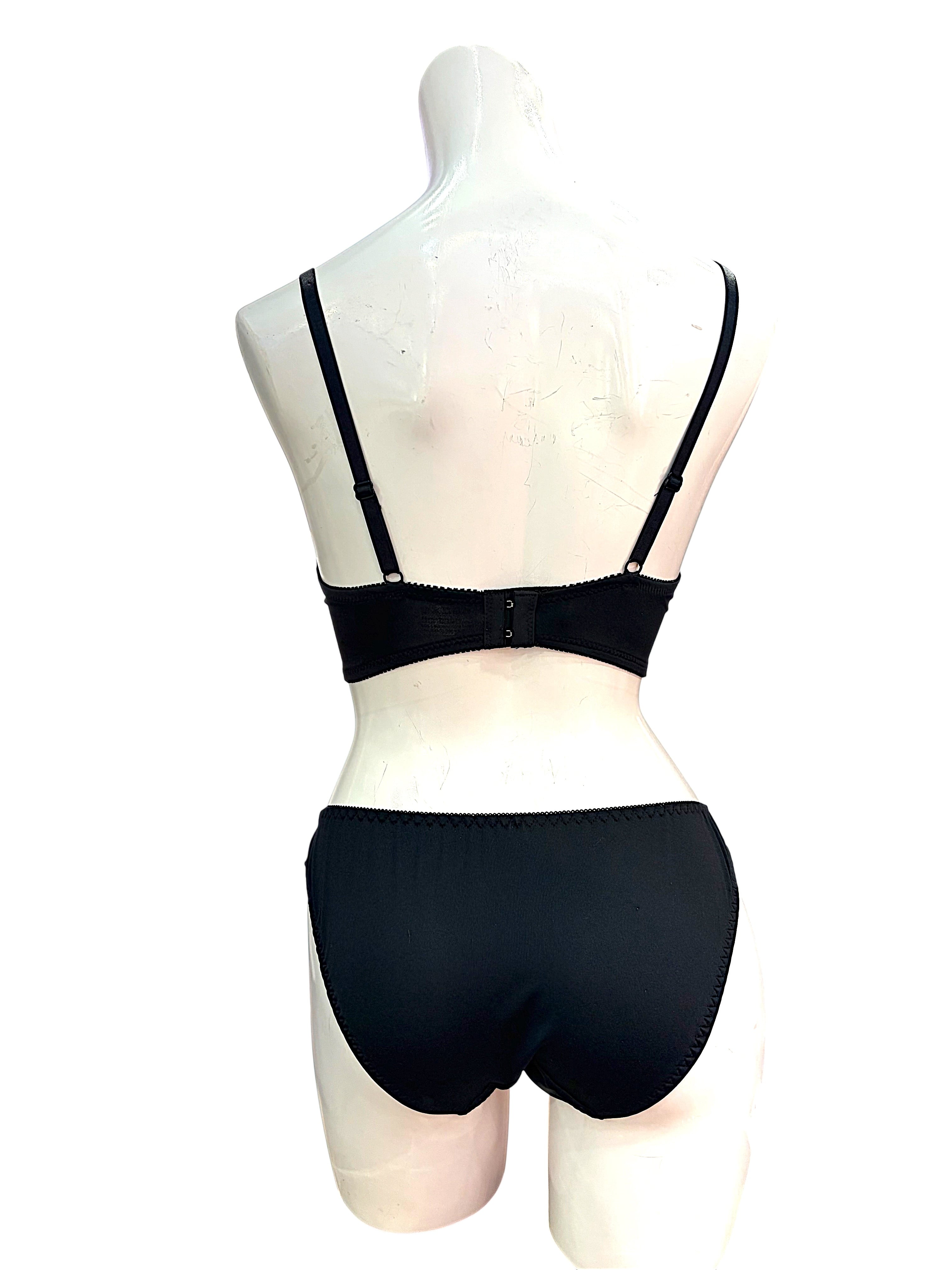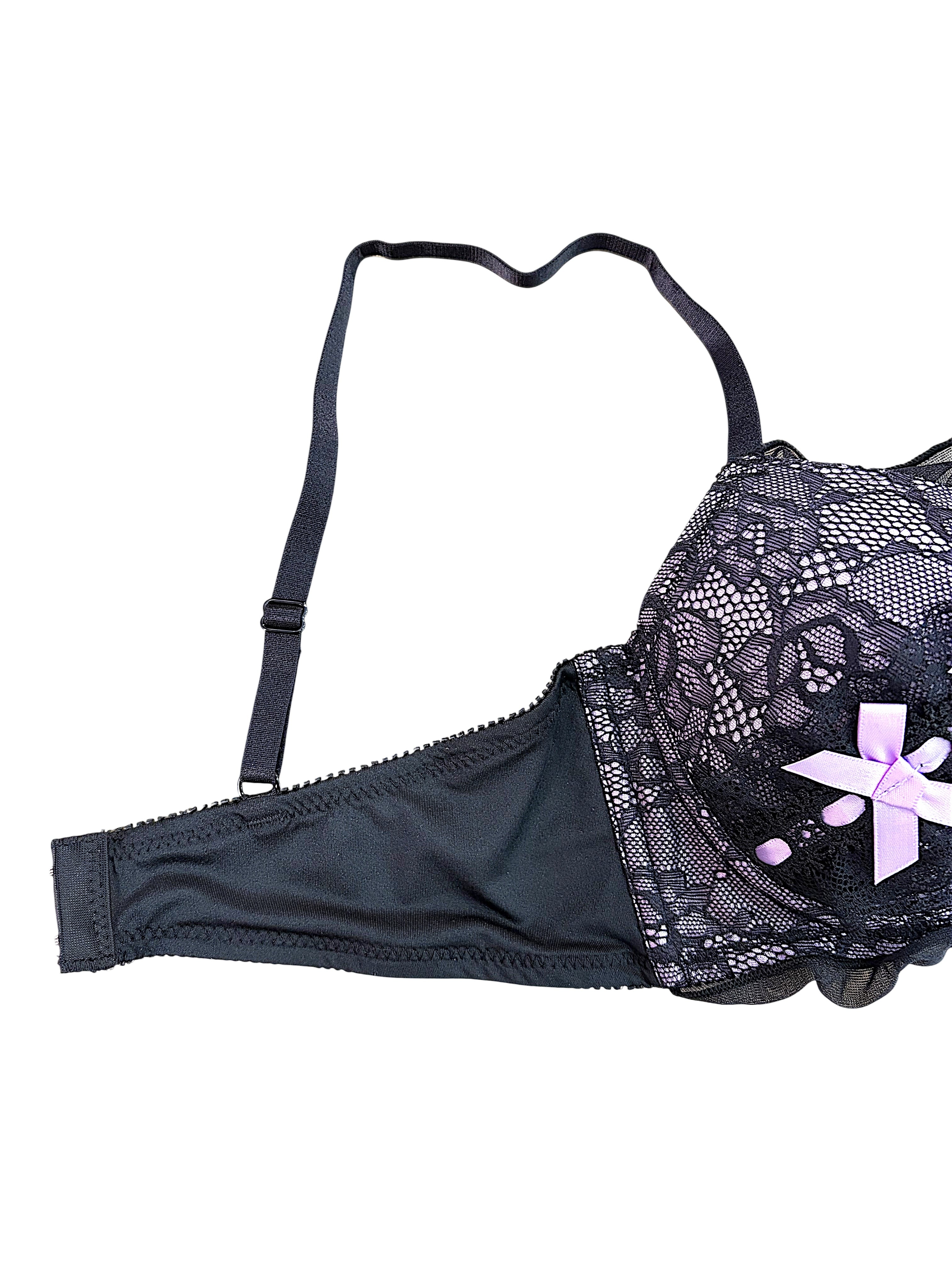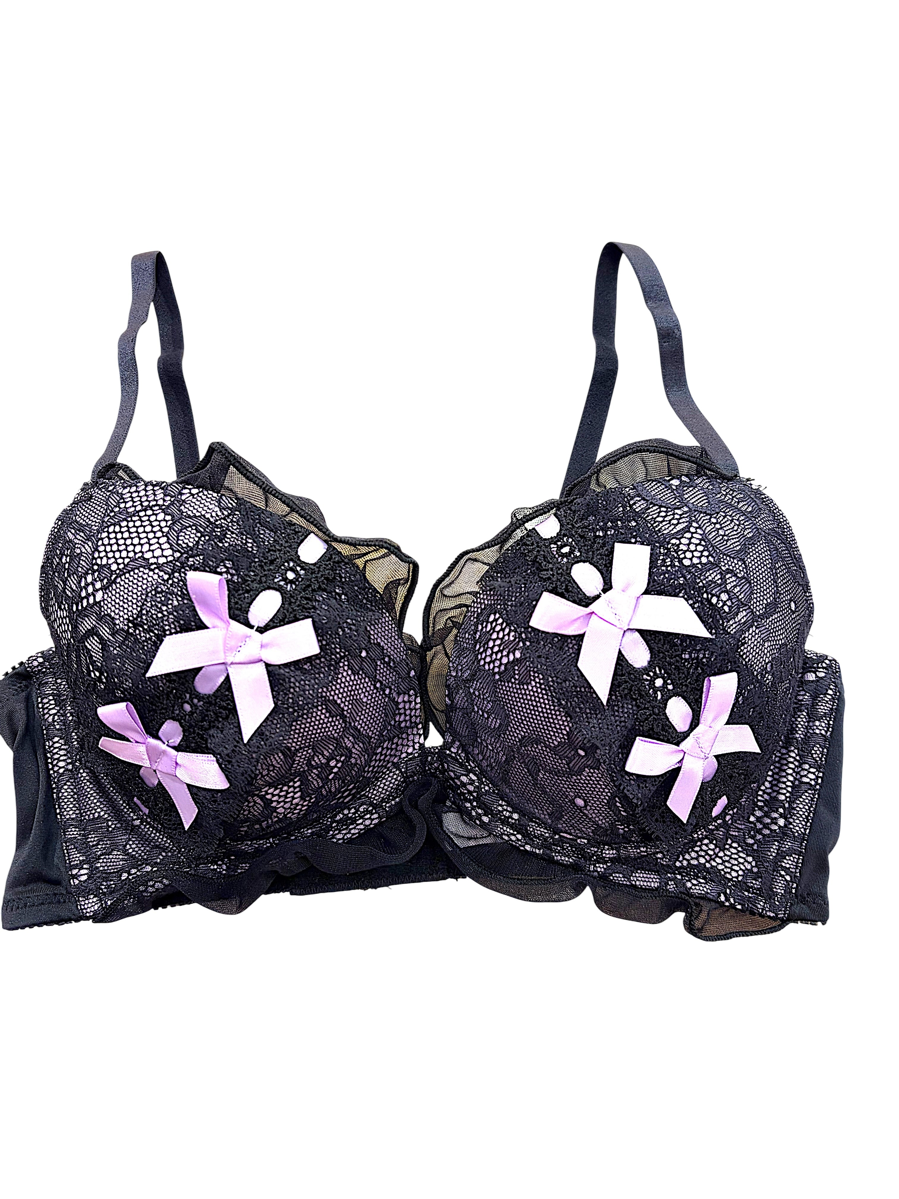 BCD【7000100 ブラック】ブラック×ラベンダーリボン 花柄レースブラ&ショーツセット