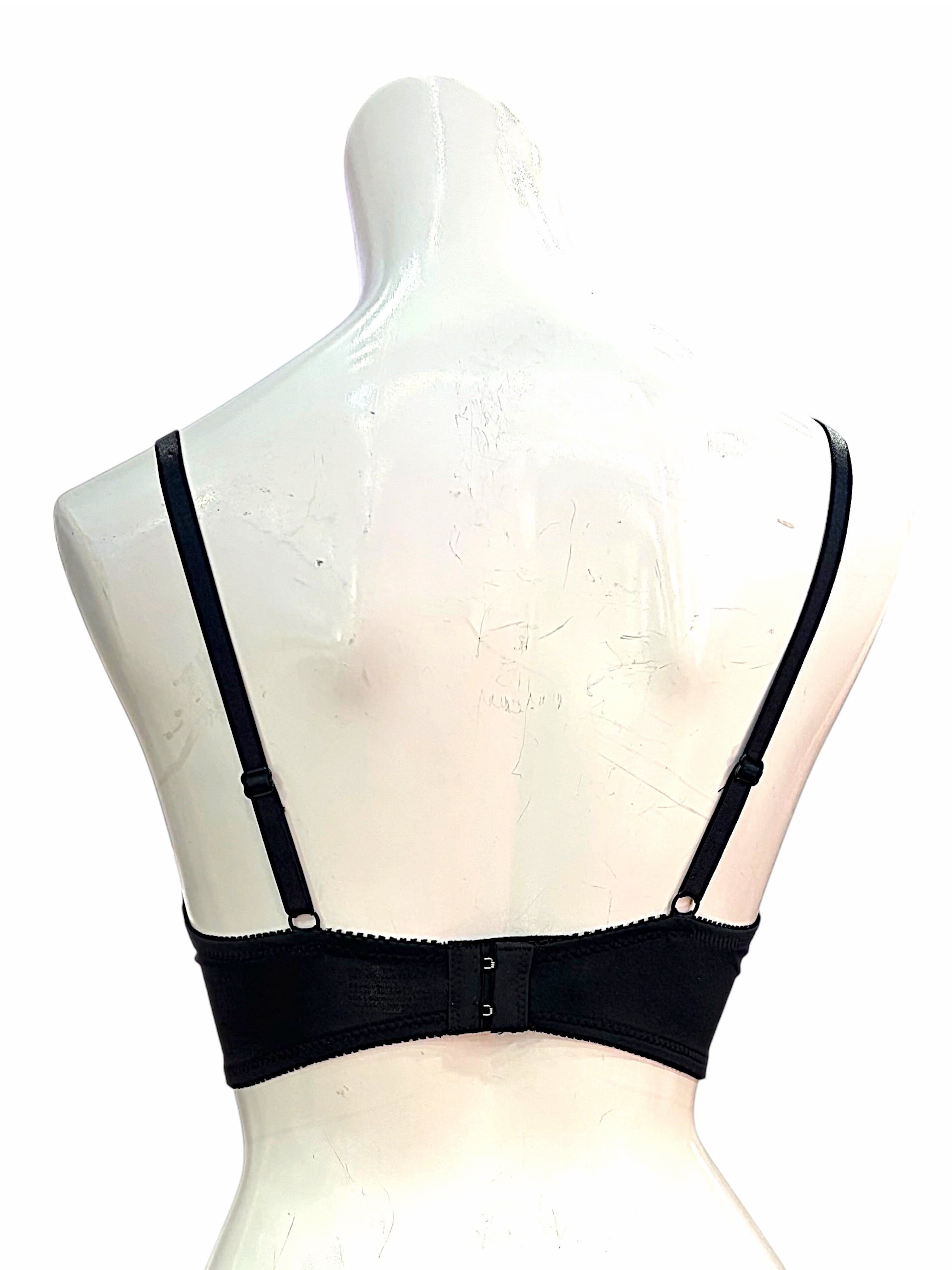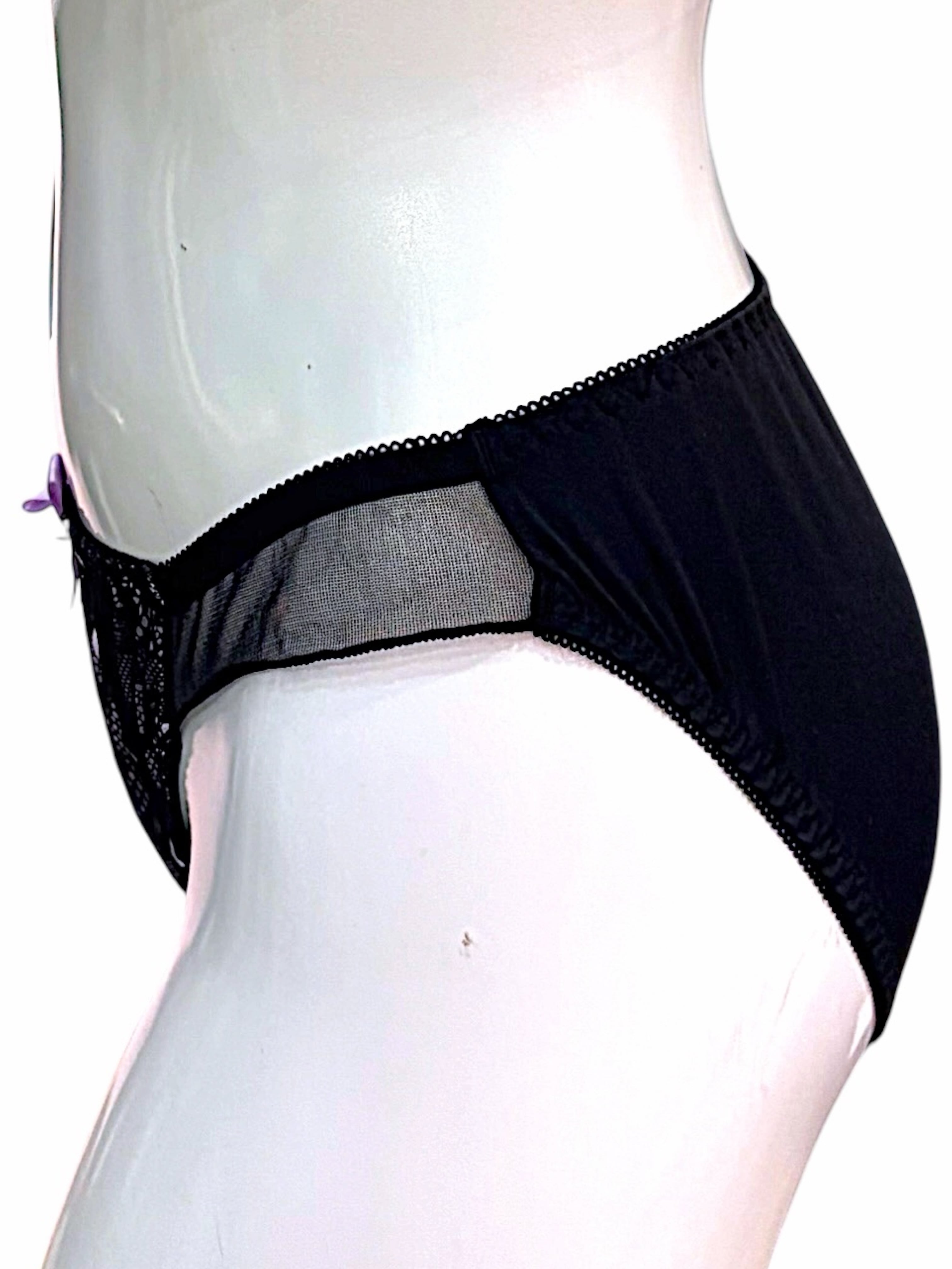 上品な黒の花柄レースに、可愛らしいラベンダーカラーのサテンリボンが華やかなポイントになったブラ&ショーツの上下セットです。