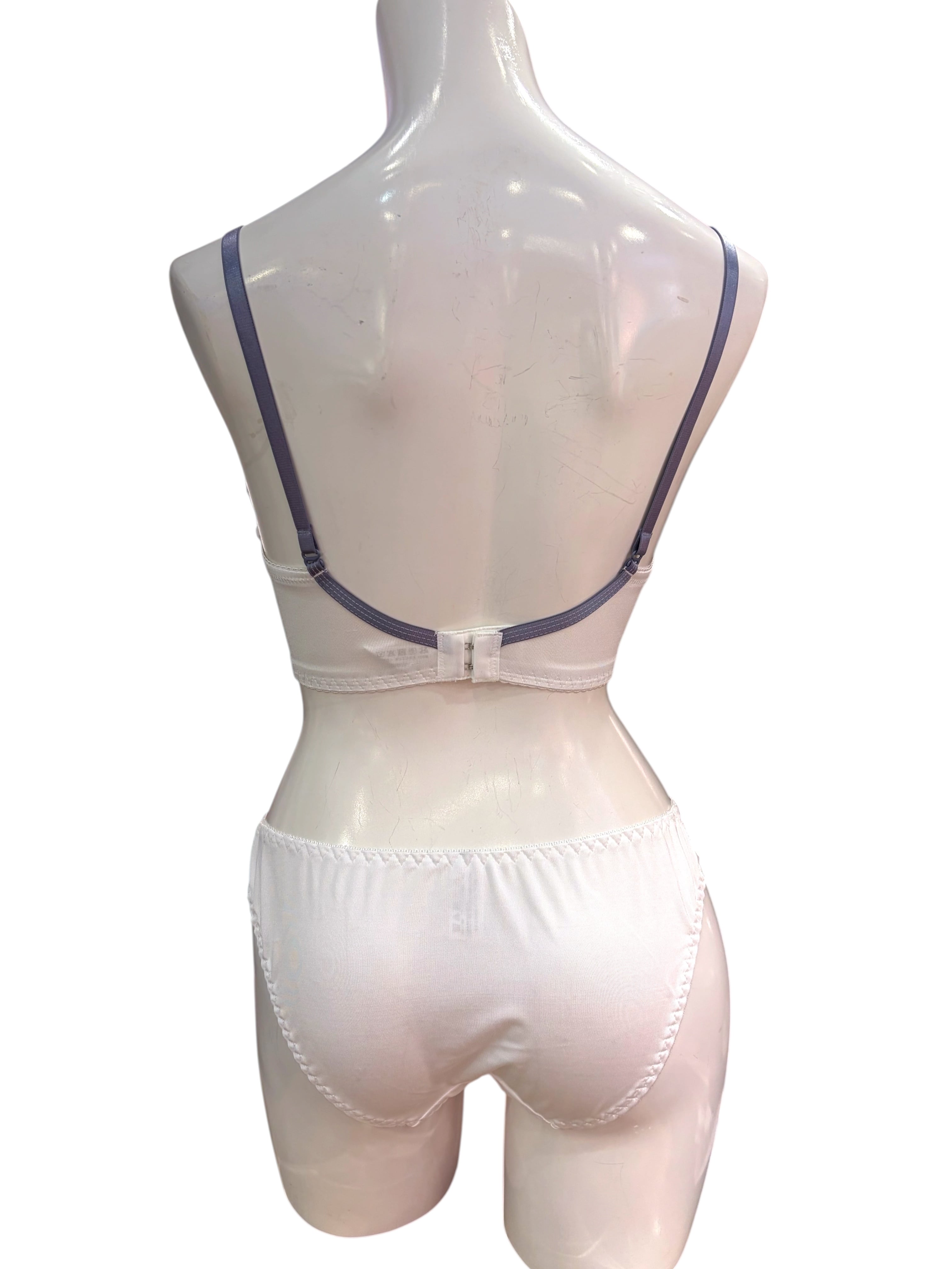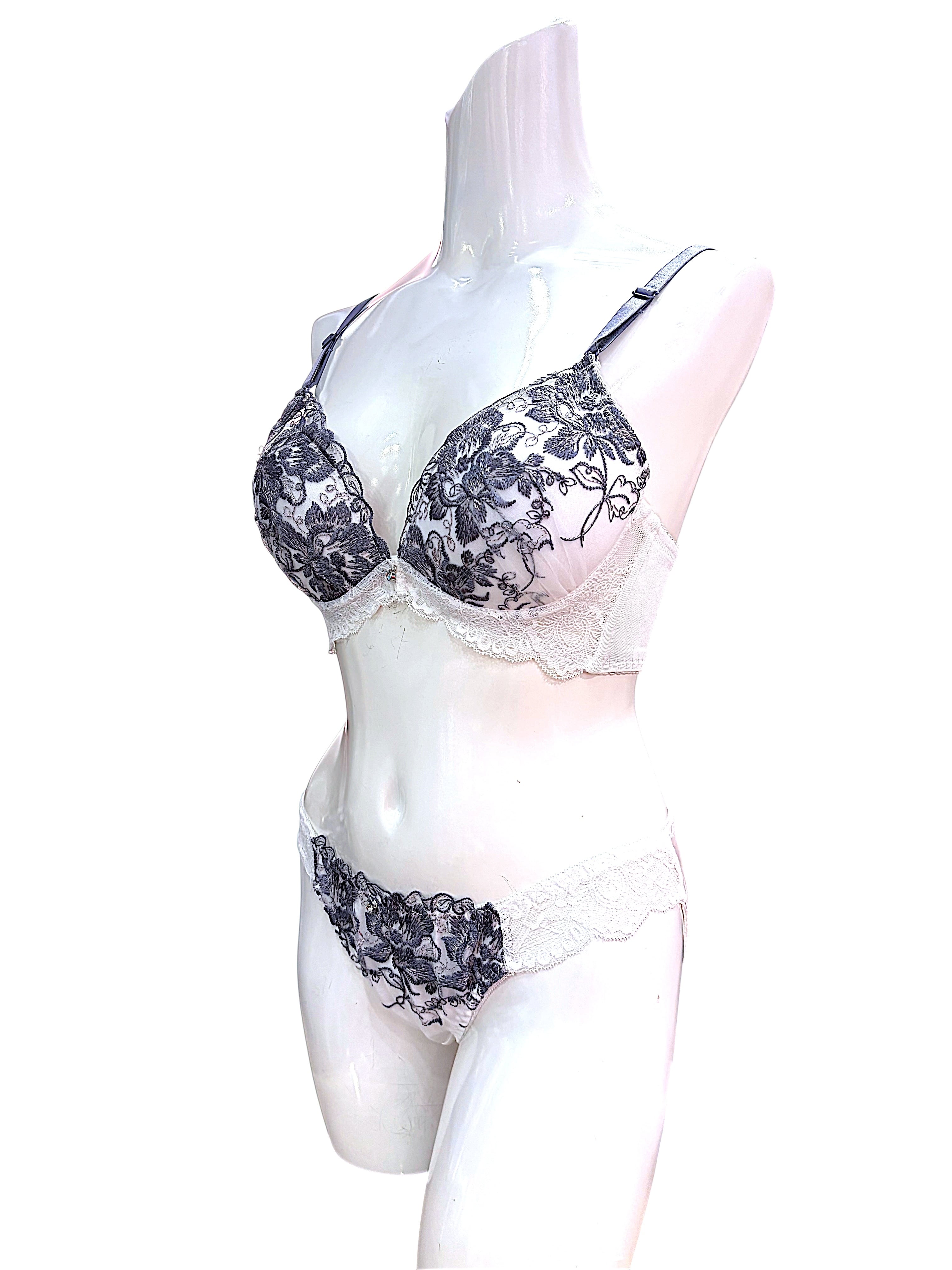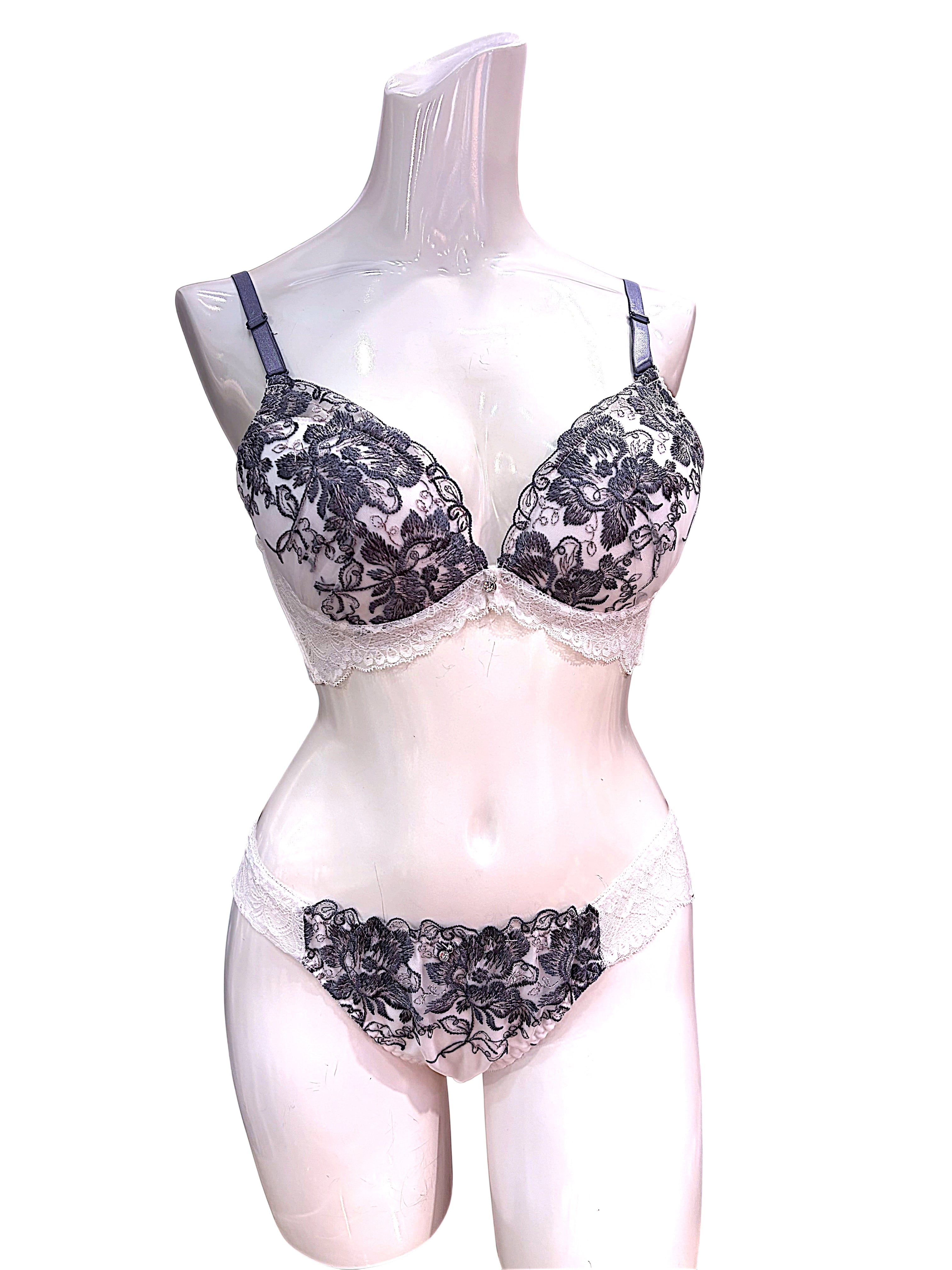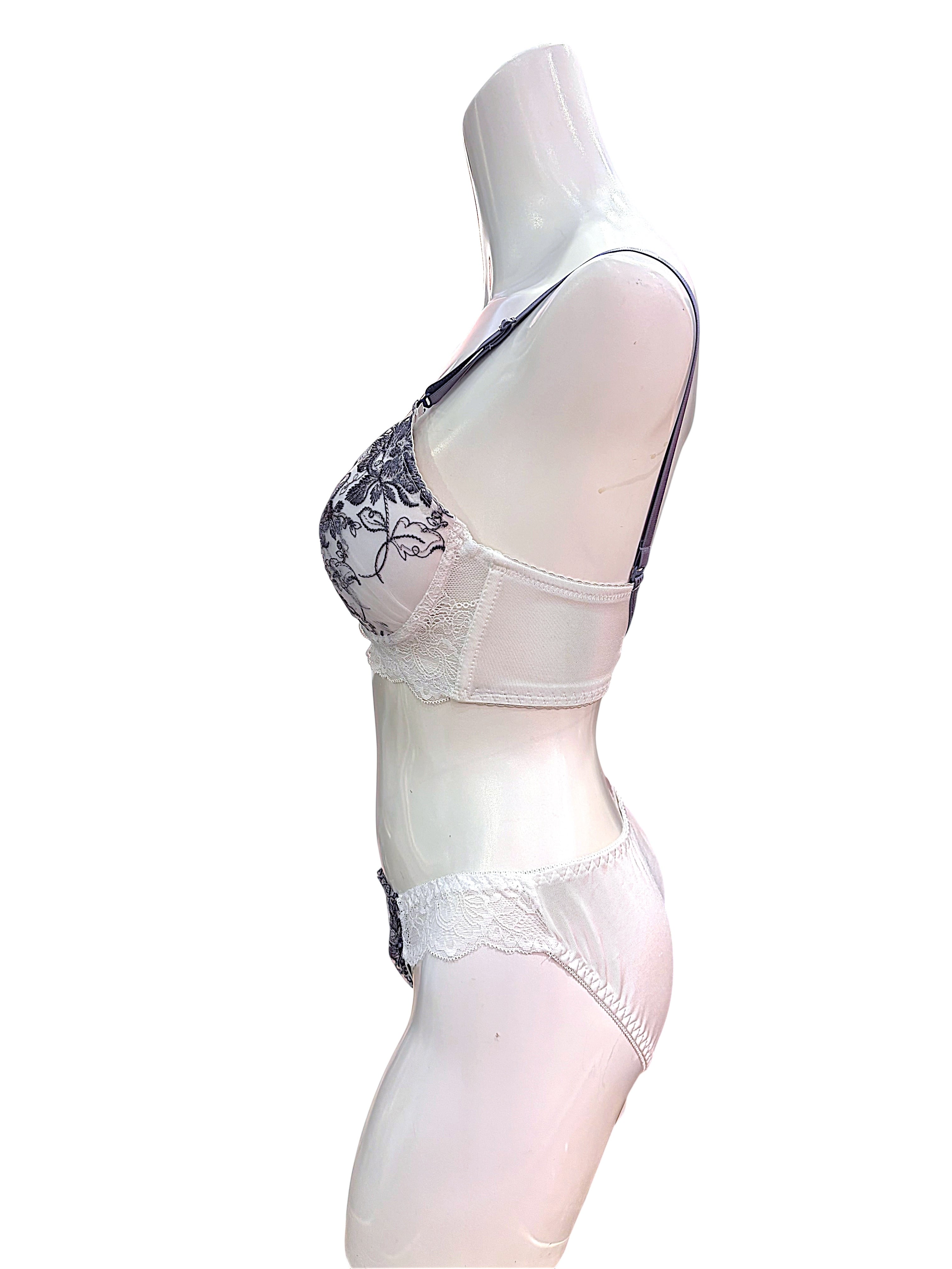 BCD【8000200 ホワイト】脇高ボタニカル刺繍レースランジェリーセット ブラ&ショーツ 上下セット ホワイト×ネイビー B/C/Dカップ対応