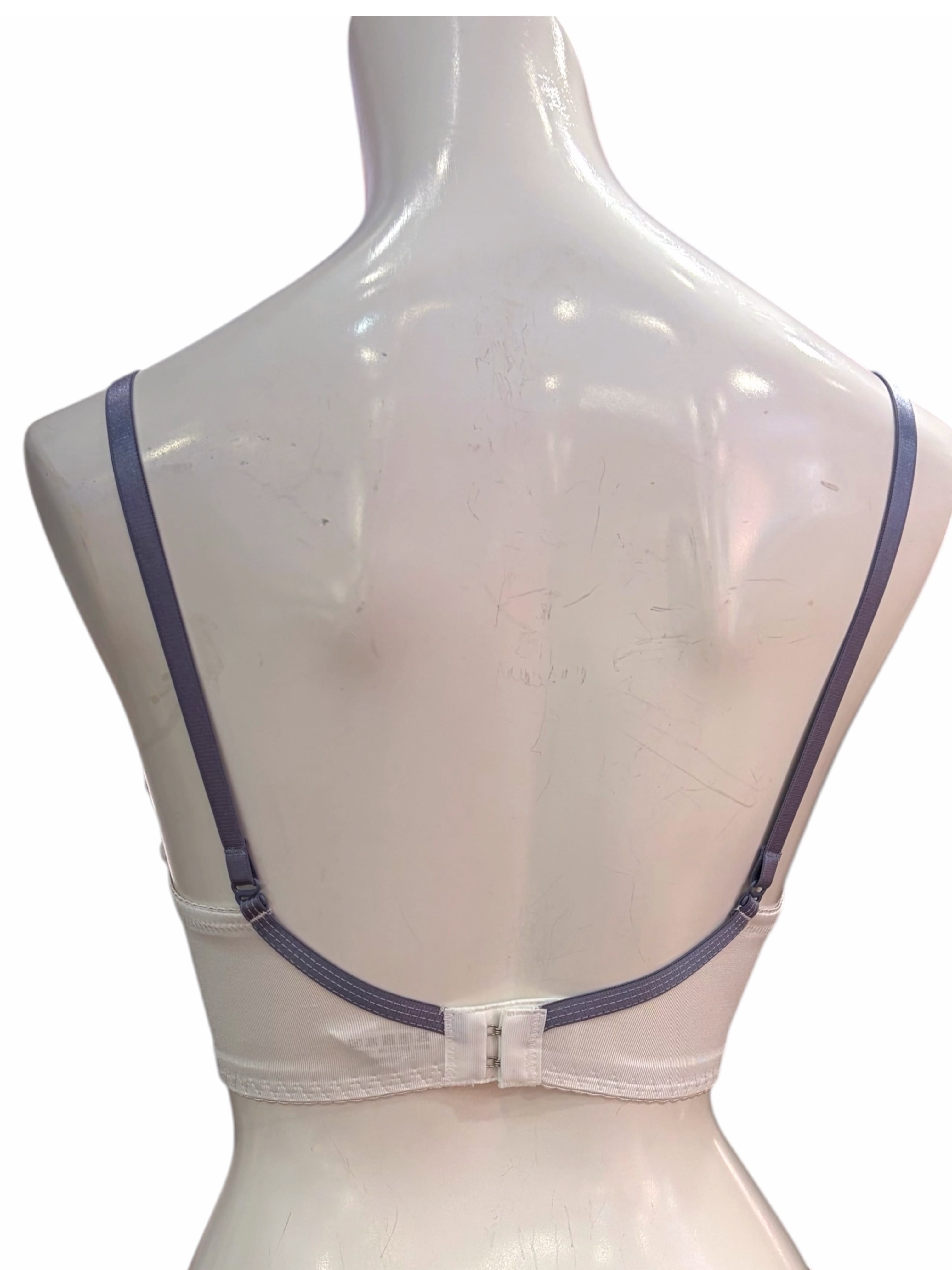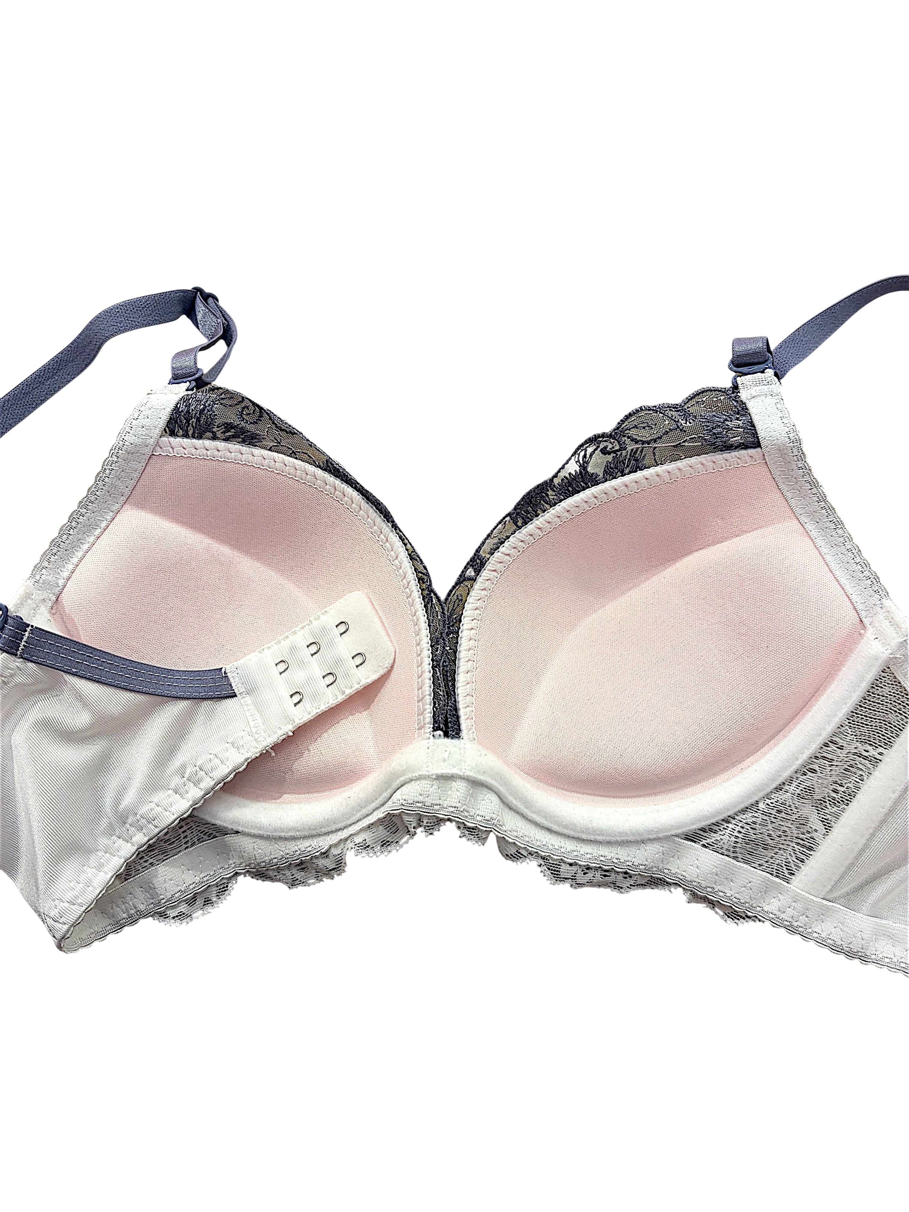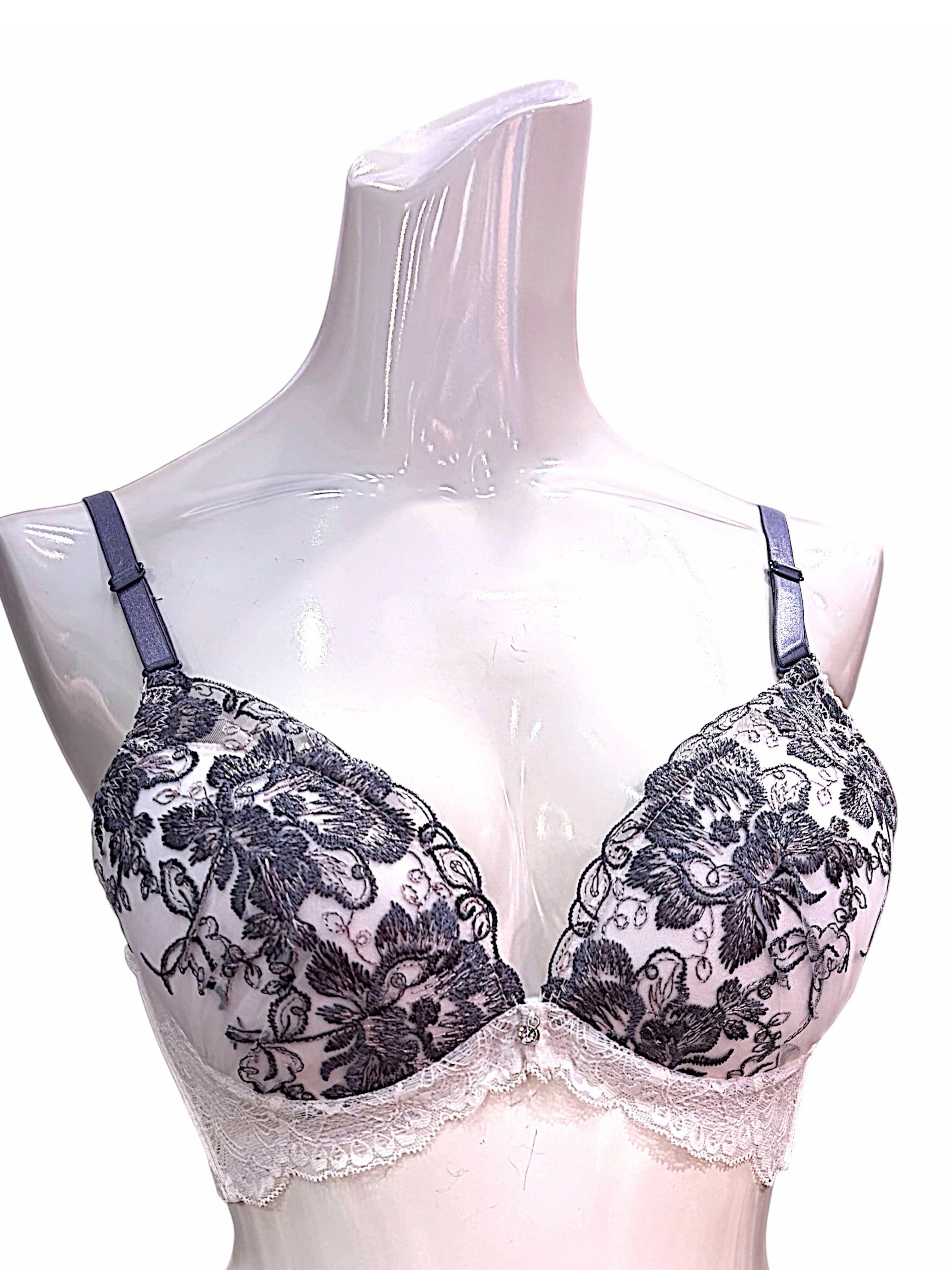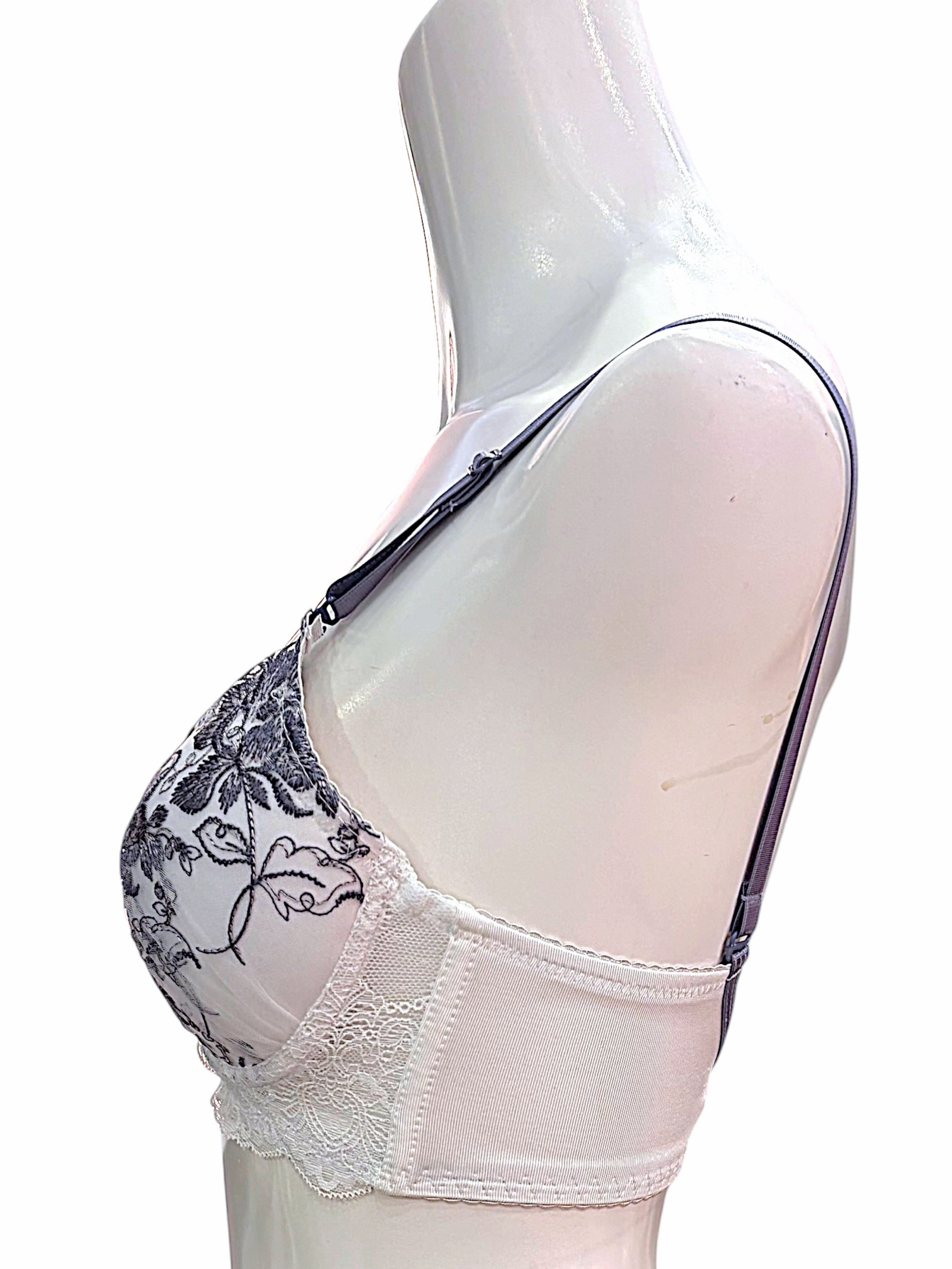 たっぷりと描かれたボタニカル花刺繍がカップ全体を覆い、シンプルな白地に贅沢な表情をプラス。ネイビーのグログランリボンストラップがアクセントになり、全体に統一感と品格を与えます。B・C・Dカップに対応しているため、幅広い体型の方にお選びいただけます。