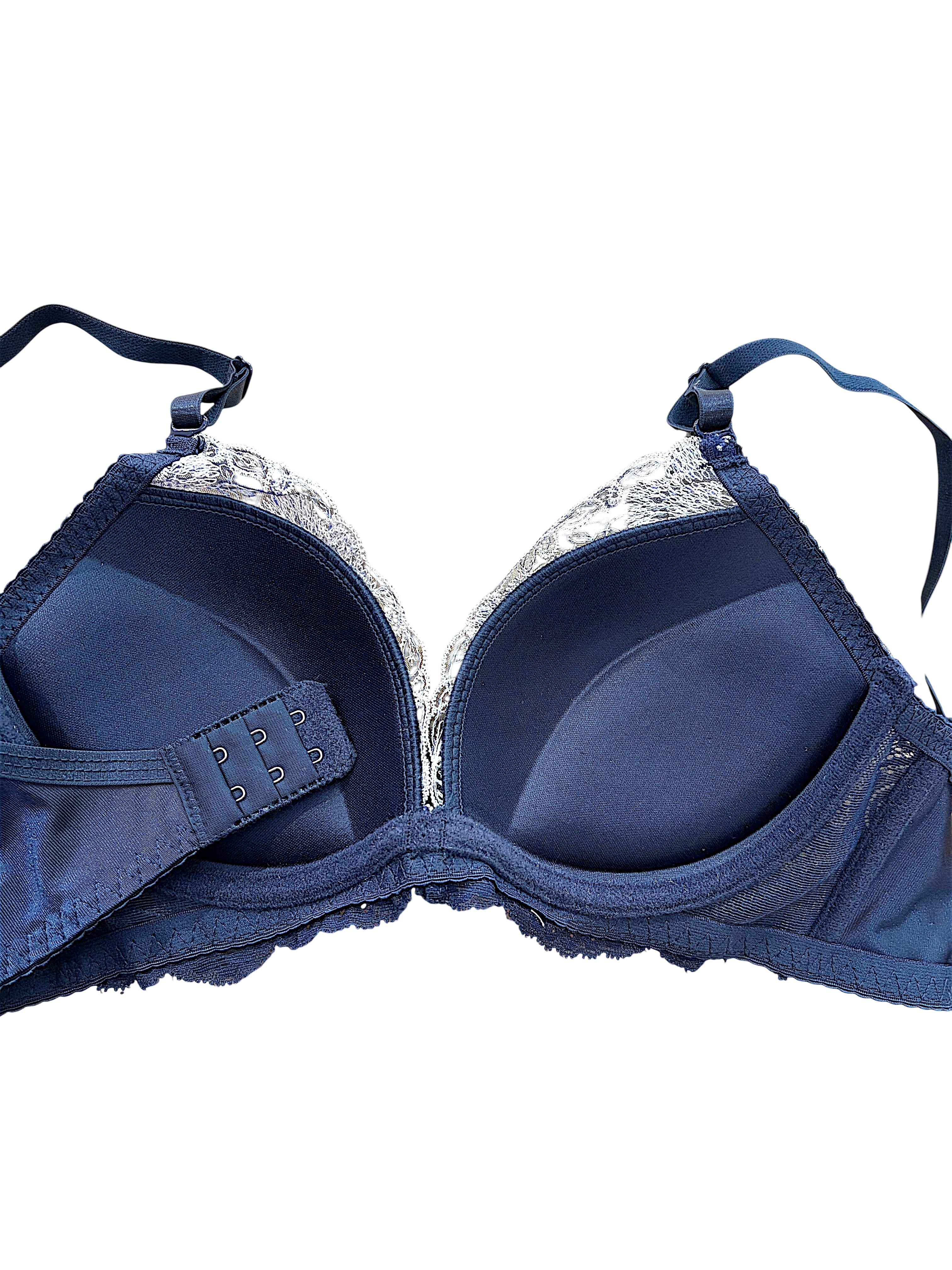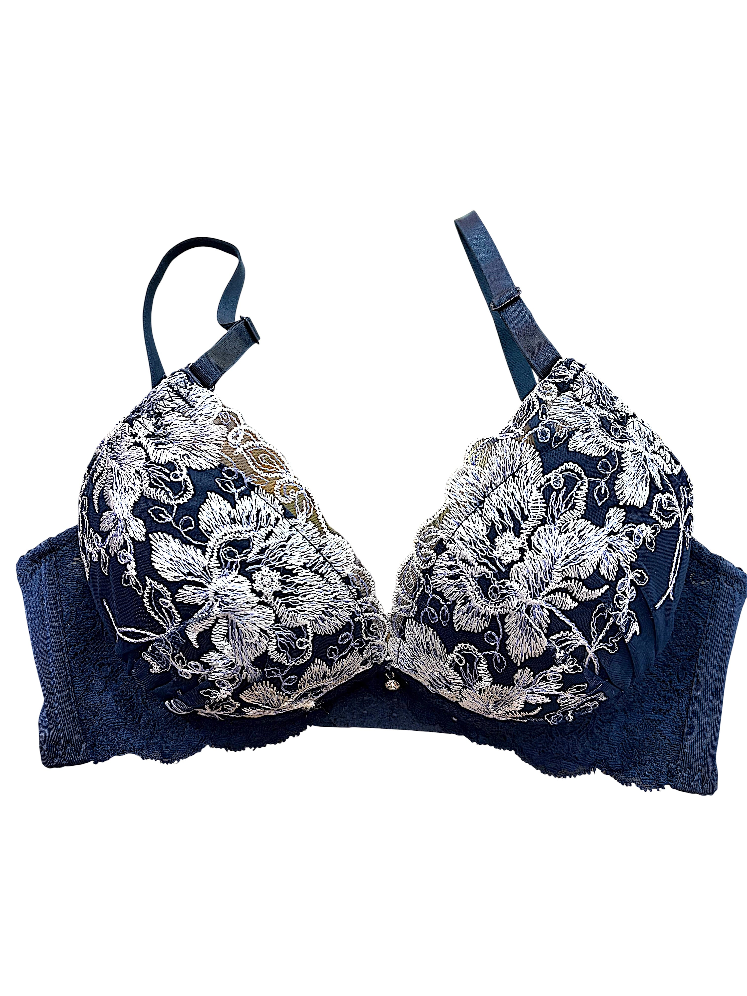 カップ全体を贅沢に覆うボタニカル刺繍は、シルバーホワイトの糸が幾重にも重なり、立体感と高級感を生み出しています。ネイビーならではの落ち着いた色味が、甘さを抑えたエレガントな印象を与えます。B・C・Dカップに対応しており、カップが大きめの方にもおしゃれを楽しんでいただける一着です。